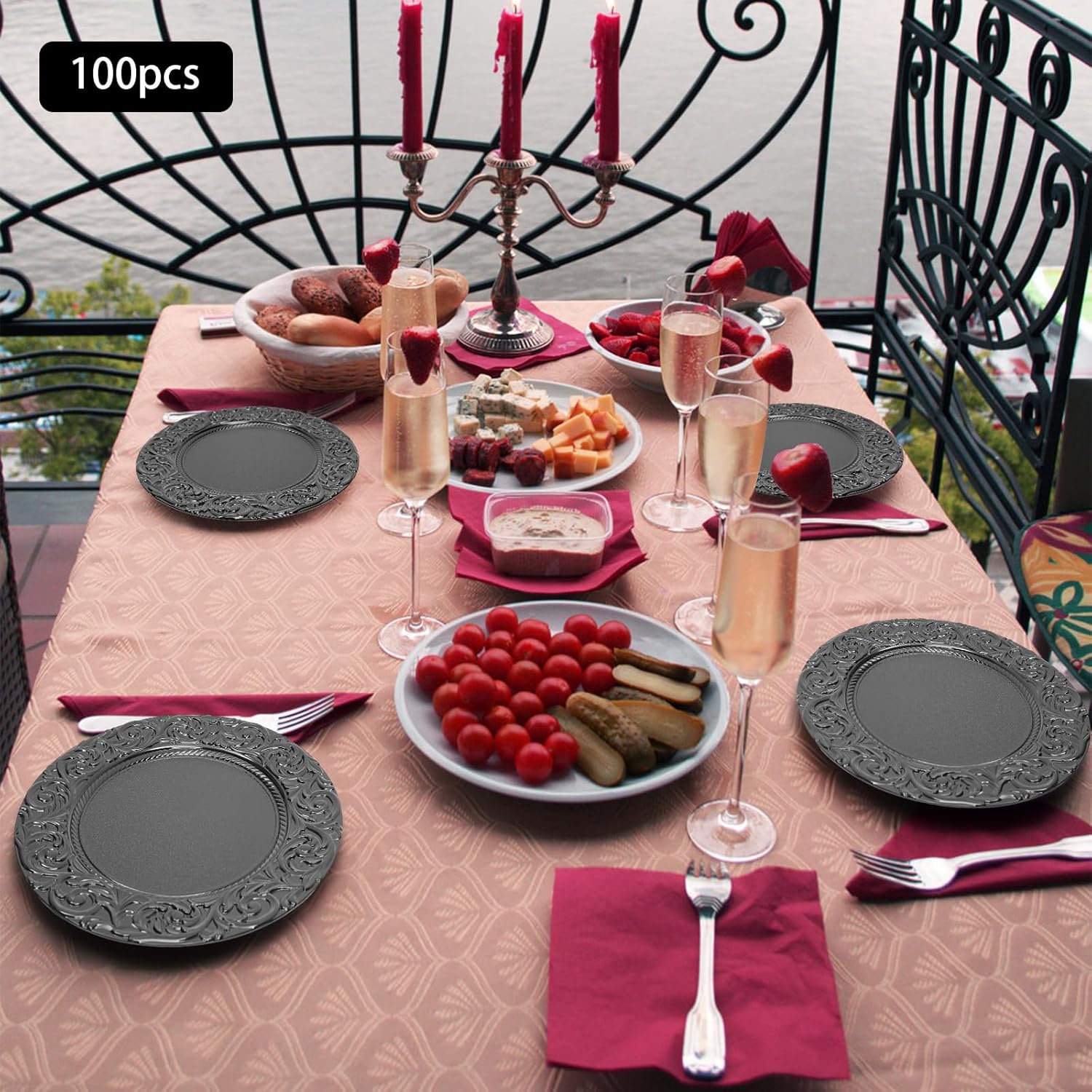 ApplicationThe product is suitable for birthday parties, holidays, weddings, banquets, baby showers, restaurants, hotels, daily life, traveling, camping, picnics, barbecues, or other events.SpecificationsColor: BlackStyle: ModernShape: RoundMaterial: PPProcess: Spraying PaintAssembly Required: NoNumber of Pieces: 100Product Size(D*H): 33*2cm/12.99*0.79inPackaging Size: 40*33*33cm/15.75*12.99*12.99inGross Weight: 17.5kg/38.58lbsNet Weight: 16kg/35.27lbsPackage Included100* Charger Plates