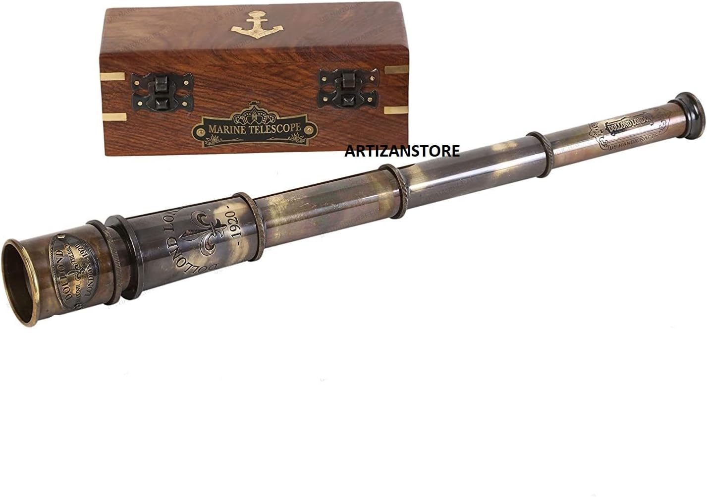 Made of high quality Brass with DF Lenses Approximately 15" in Total Length Includes a Wood Display Case after Old Style Telescopes Wonderful Nautical or Pirate Collector Piece.