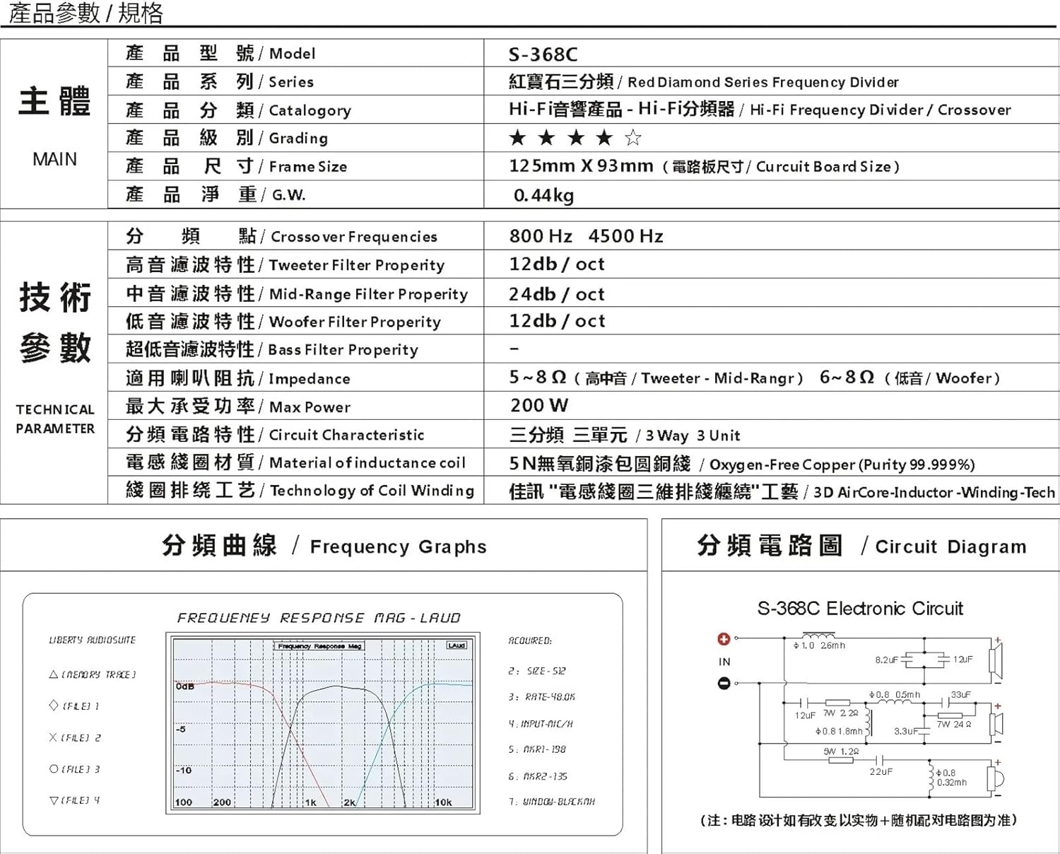 Audio CrossoversSpecificationsProduct Name: 3 Way Frequency DividerCrossover Frequency: 800/4500HzImpedance: 5-8 ohmPeak Power: 200WWeight:440g/PiecePackage Included:2PCS Frequency Divider