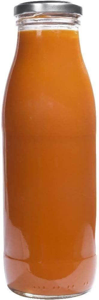 4 glass bottles for self-filling, each 500 ml with 8 x twist caps To48 silver and 4 labels for labelling and sticking. Attractive wide mouth bottle Classic milk bottle, also good for sauces, juices, etc. Details and dimensions: capacity: 500 ml / 0.5 litres (nominal volume). Height: approx. 20.5 cm, diameter of each bottle: diameter 6.9 cm, opening diameter: 3.7 cm, set consists of: 4 bottles, 8 x silver screw caps and 4 decorative adhesive labels 63 x 40 mm made of PE film