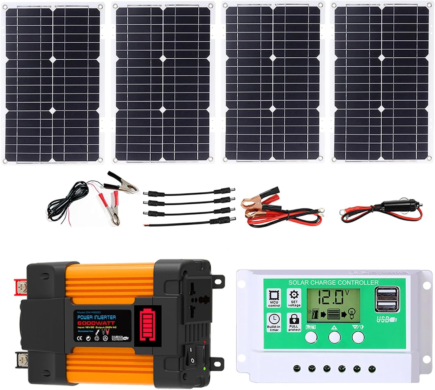 Specifications:inverter:Color: YellowName: Car Power InverterInput Voltage: DC 12V (Voltage Range: 10.5V~15V)(When the battery voltage is lower than 10.5V, the inverter is in low voltage protection state, and when the battery voltage is higher than 15V, the inverter is in high voltage protection state)Output Voltage: AC 110V/220V for your choiceOutput Frequency: 50Hz for 220V model/60Hz for 110V model.Peak Power: 4000W/6000wRated Power: 300W/500wOutput Waveform: Improved Sine WaveProduct Dimensions: 8.1X4.6X23 inWeight: 600g/700gSolar panels:Power: 50W± 5%Size: 1127x420x3mmDC IN/OUT outout: 12V/2.4AUSB output: 5V/2.4AWeight: 1.5kgType: Mono Solar PanelMaterial: Aluminum substrate+effcient chip+PETOutput accessories: 4XDC cable + 2XDC alligator clipController:Voltage: DC 12V/24VRated charge current: 50AFloating charge voltage: 13.7V (adjustable)End-off voltage: 10.7V (adjustable)Discharge recover voltage: 12.6V (adjustable)USB output: 5V/3A Max<;10mAOperating temperature: -35℃-60℃Size:133.5 * 70 * 35mmColor: White+greenMaterial: ABS