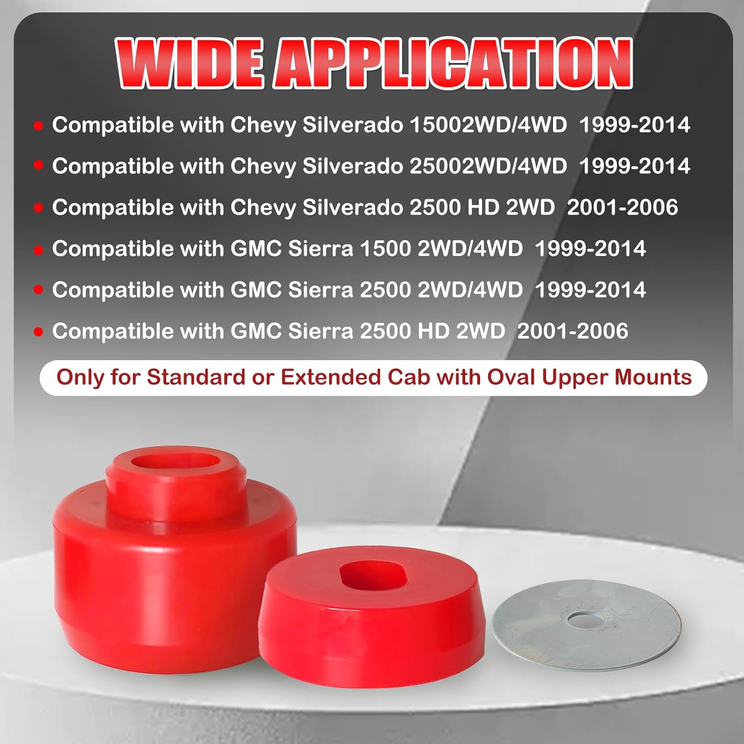 FITMENT : Compatible with 1999-2014 Chevy Silverado and GMC Sierra 1500/2500 2WD/4WD Can be Directly Replaced With The Original Factory Bracket.Superior Material : High-density polyurethane blend for optimal resilience. High-temperature and corrosion-resistant for longevity.Superior impact absorption and anti-aging properties. Reinforced construction for dependable performance. Steel sleeves and hardware for added strength and durability.Function : These bushings offer exceptional durability, tear resistance, and performance compared to original rubber mounts maintain proper body and frame alignment, provide more positive attachment to the frame and help insulate the cab while maintaining superior holding power and cushioning effect. Package Includes : 8× Upper Body Mounts (Part#68106) | 8× Lower Body Mounts (Part#68107) | 8× Washers (Part#1163) Note: Sleeves and bolts not included.Quality Guarantee: This product meets or exceeds OEM standards and has been rigorously tested before leaving the factory. If you have any questions, our professional team is always ready to assist you we will be happy to provide you with support at any time.