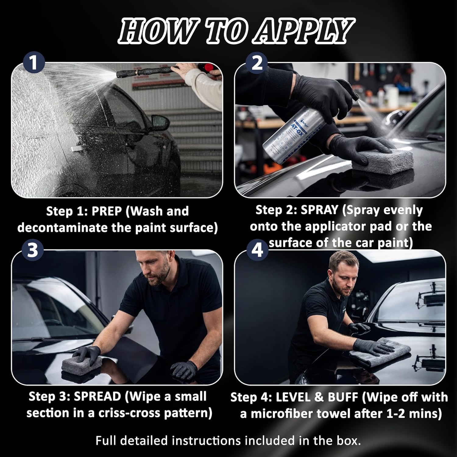 | Recommended Uses For Product | Step 2:Apply: Before applying, ensure the bottle is shaken vigorously to mix the product thoroughly. Install the spray head and adjust the nozzle to the "Open" mode. Spray the product onto a towel or gray sponge until it is evenly dampened., Step3:Using a clean, dry microfibertowel, gently buff off residueuntil a high gloss is achieved., Step4:Continue panel by paneluntil the entire vehicle is coated. Allow 12-24 hours for afull chemical cure, and avoidwashing or rain during this period., Step:1:Ensure the car surface is cool,clean,and in the shade. A thorough wash and decontamination are essentialfirst steps. |