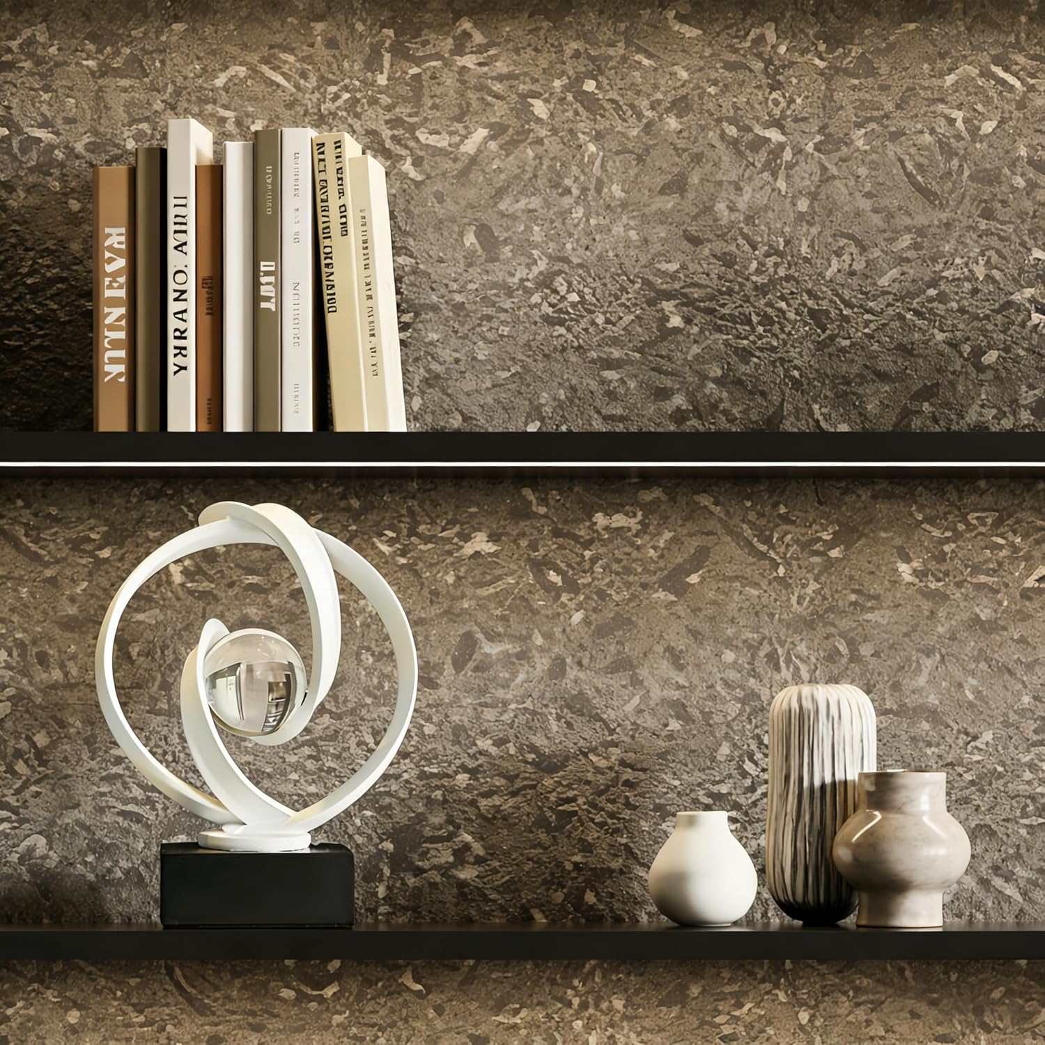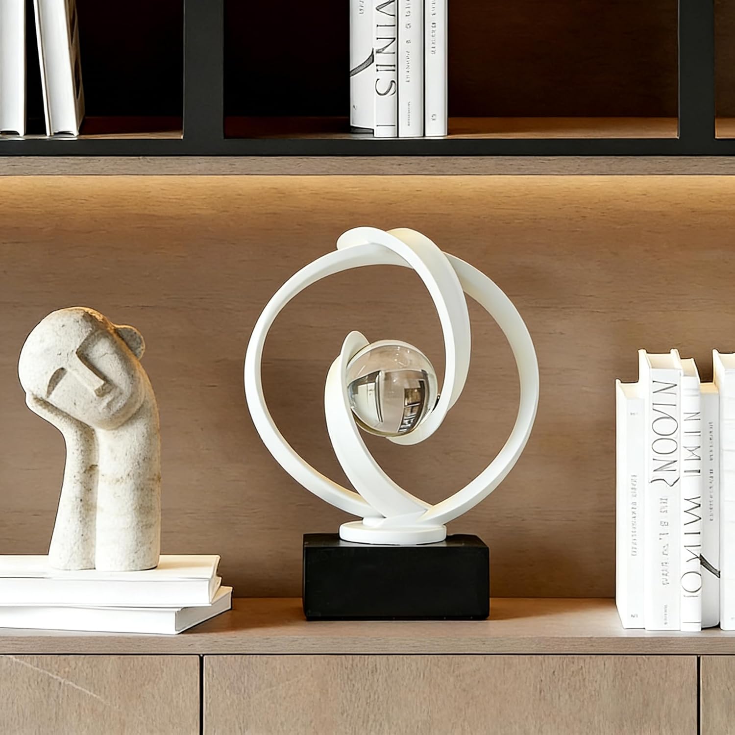 This gold abstract sculpture features three dynamic interlocking rings holding a crystal sphere on black base. Gold-plated surface maintains luster, while crystal ball's internal details create ever-changing visual effects. Perfect for modern living rooms, luxury studies or office spaces.