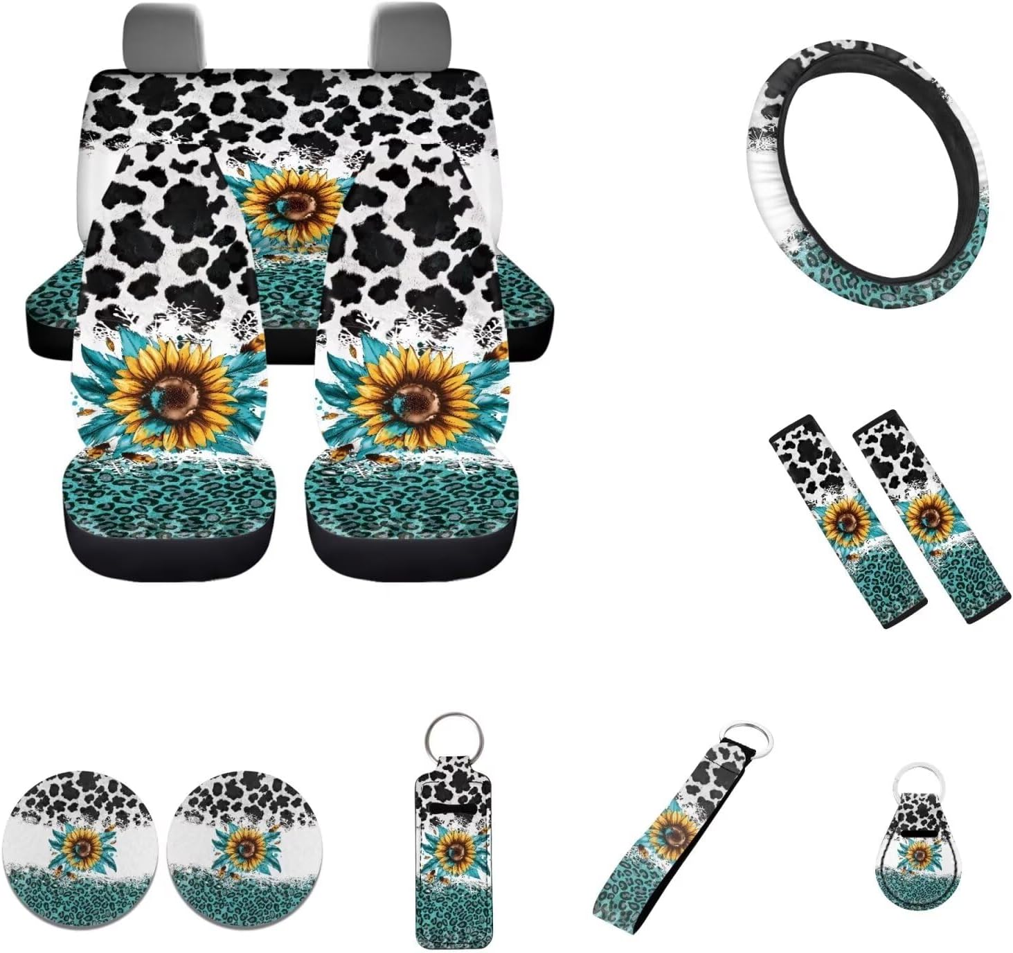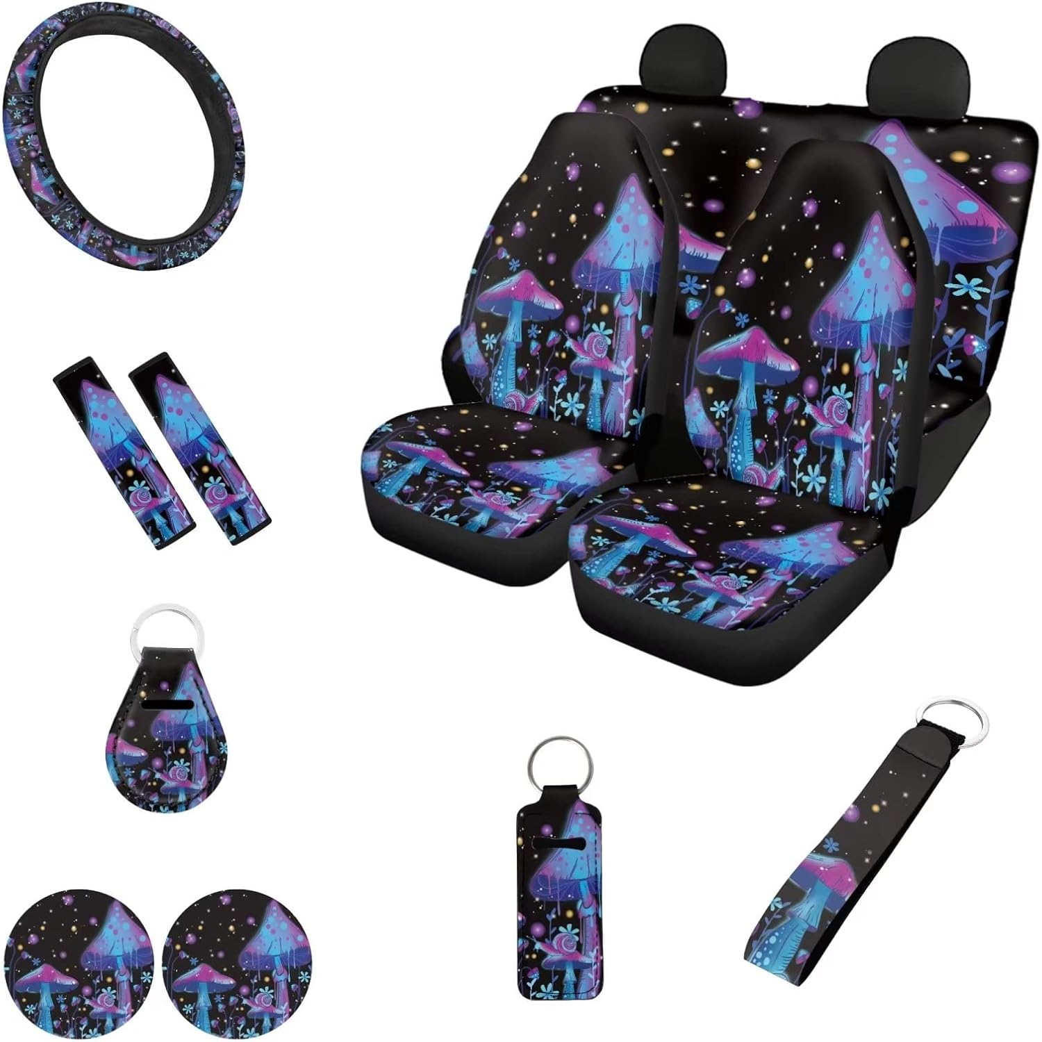 Biyejit Car Seat Covers Set Car Interior Protector Accessories Universal Fit Features of Car Seat Covers -Seat Covers can keep your interior looking new, cover existing damage. -Protect your cars seats from dirt and spills, UV rays, spills, kids, pets, tools, entry/exit friction, food, sweat, ect. -Easy to install and remove,machine washable. Features of Steering Wheel Cover -Protect the steering wheel cover and make it fashion looking. -Stretchable fabric with high-density good quality anti-slip backing. -Easy to install and washable. High quality elastic banding. Features of Car Seat Belt Pad -Great for protecting your shoulder and reducing the pressure from the safety seat belt. -Provides comfort and helps relieve chafing. -High grinding and abrasion resistant. Features of Car Coasters Keeps the water from making a big mess when your drink starts to melt. Anti-slip design. Keep your car coaster stay in place. Features of Key Chains You can attach them to your purse, keys, bags, backpack, locker hook, make up bag, carry on bag, gym bag, etc. Features of Lipstick Holder Key Chain 9.6x4cm/3.7x1.5in,Fabric and stitching, neat seams, durable, metal key chain that can protect and decorate your lipstick without worrying about the bag Can't find lip balm. Great Gifts Those cute car auto interior decorative accessories will make your every journey bright and positive. They are one of the most appreciated car accessories and will make a great present for friends who spend time in their car and like to enjoy beauty and safety altogether.