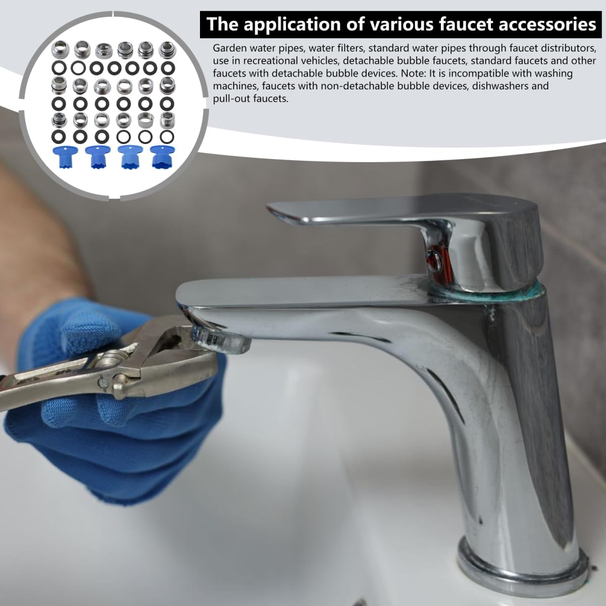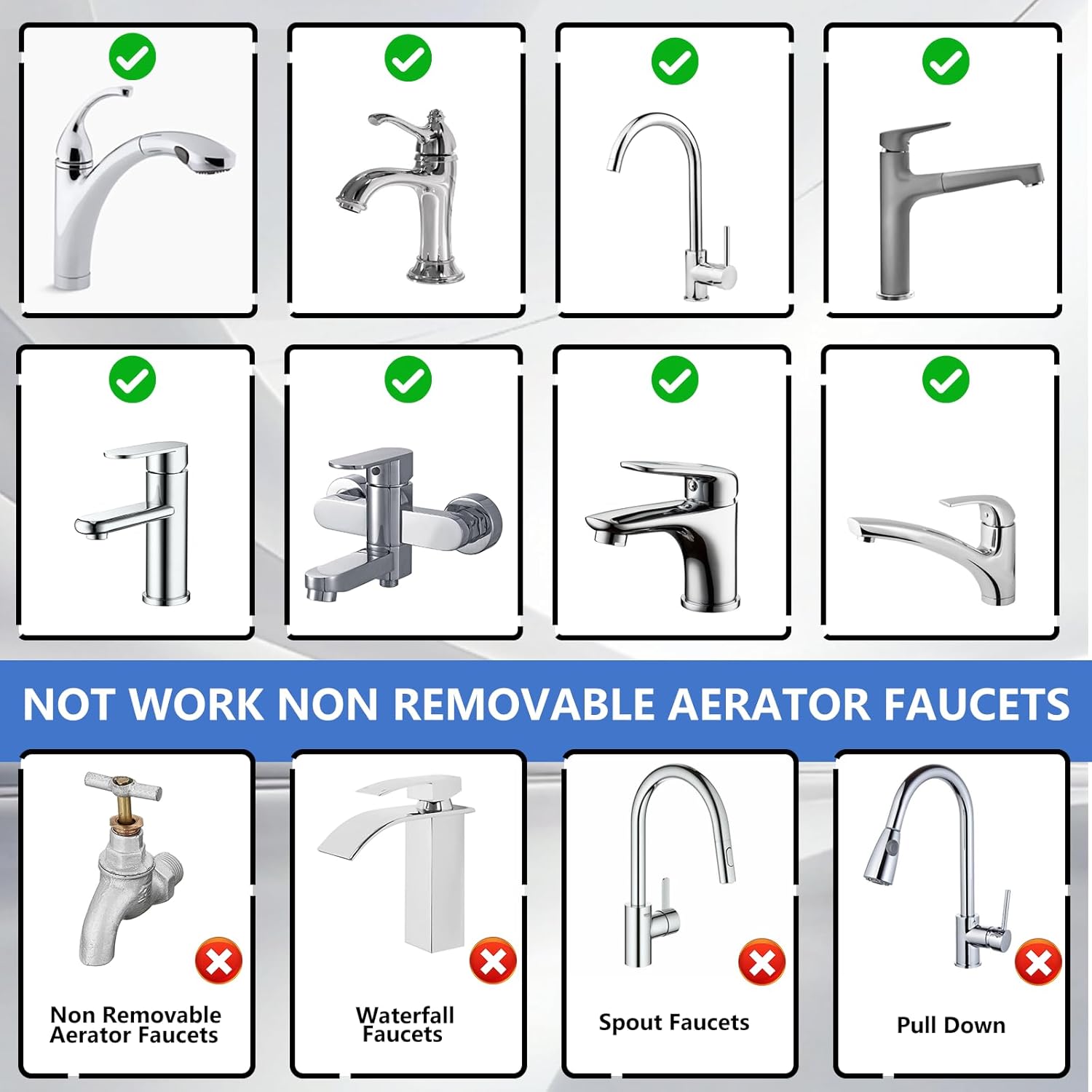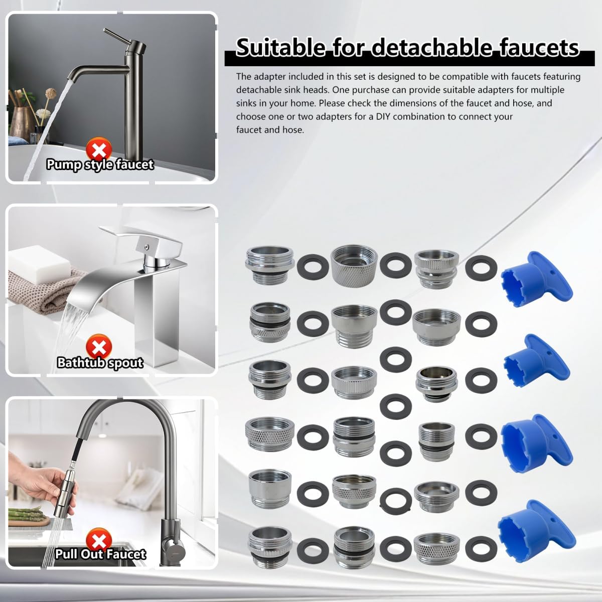 Bottlestalk 18 Pieces Faucet Adapter Kit Kitchen Sink Aerator Adapters with 4Pcs Removal Wrench Tools, Fits for Removable Sink Aerators Faucets18Pcs Brass Faucet Adapter KitCompatible for faucets that have removable sink aerators. Suitable for Garden hoses, water filters, standard hose via faucet diverter, in RV's, removable aerator style faucets, standard faucets and other have removable aerators.NOT Compatible for washing machines, faucets with non-removable aerators, or dishwasher and pull-down faucets.Size: Female 3/4" - 27T, Female 13/16" - 27T, Female G1/2, Female NH 3/4, Female 15/16" - 27T, Female 55/64" - 27T, Female 55/64" - 27T, Male 3/4" - 27T, Male 13/16" - 27T, Male 55/64" - 27T, Male 15/16" - 27T, Male 3/8" - 27T, Male M28 x1.0, Male M21.5x1.5, Male 16.5-27UNS, Male 18.5-27UNS, Male 21.5-27UNSPlease check the dimensions of the faucet and hose, and choose one or two adapters to DIY combine to connect your faucet and hose.Please check that the rubber gasket is properly installed and the joint thread is properly aligned to prevent water leakage.