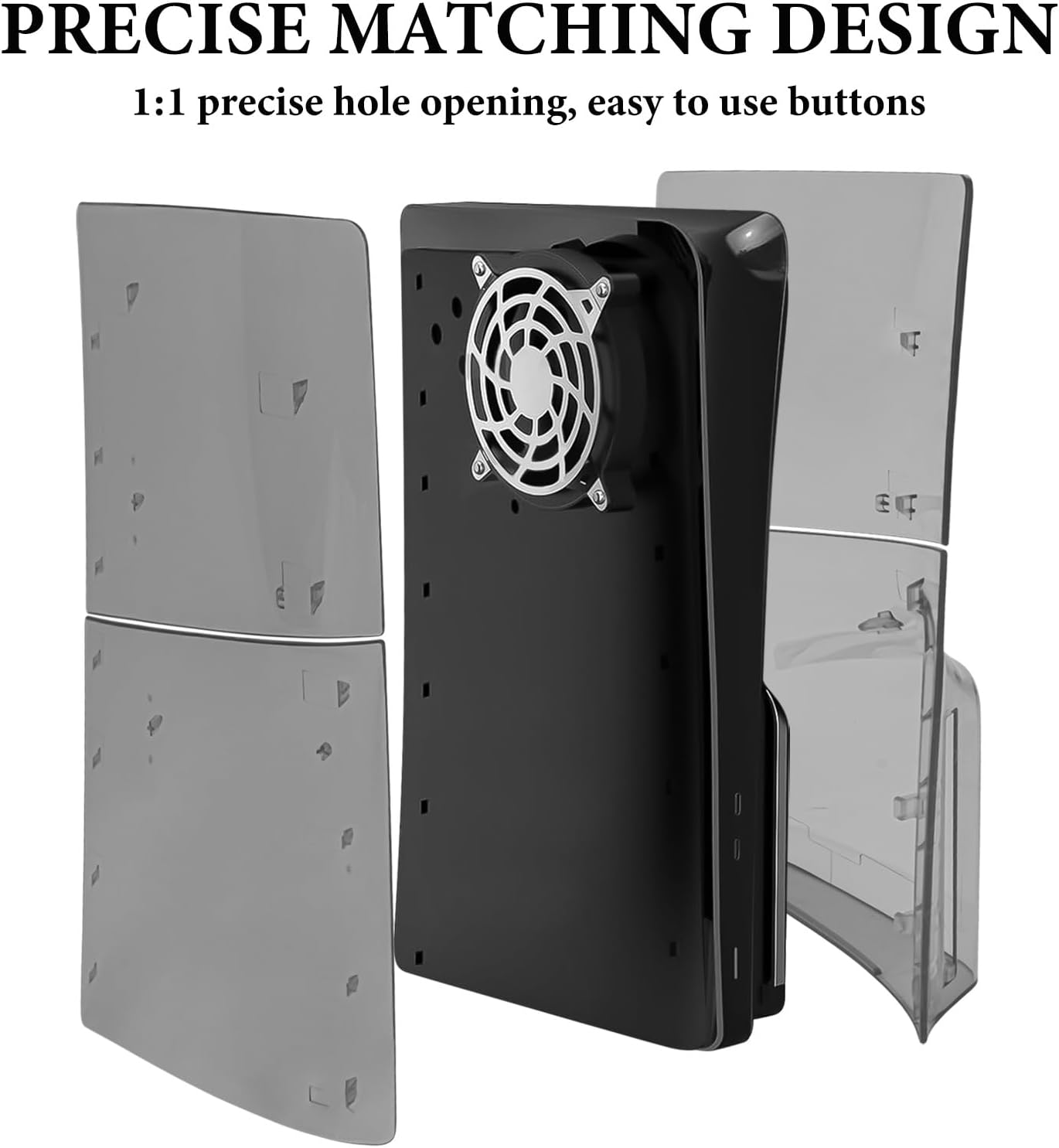 Heat Dissipation Design There are cooling holes on both sides of the panel to help the PS5 cool down while running. Easy to Install Start by laying the console flat. Then press and hold the diagonal edges of the PS5 Slim panel and slowly lift it to the left to remove the original case. Then line up the holes and place the plate over the console. Success is heard when a "click" sound is heard. No other tools are required. Note: PS5 Console Faceplate Cover x 1, Only for PS5 Silm Disc Edition. (Other devices are not included)