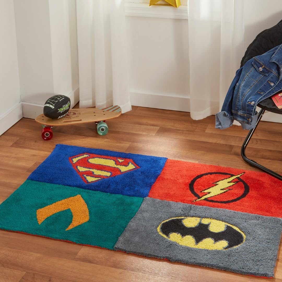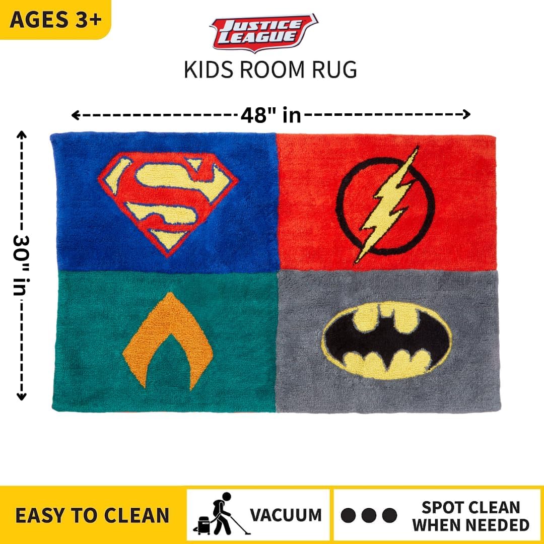 Elevate your decor with the Justice League 30"x48" area rug, crafted from soft and durable cotton for comfort and longevity. Its captivating quadrant design proudly displays the iconic logos of Superman, Flash, Green Lantern, and Batman, making it a must-have for any superhero enthusiast. Indulge in the nostalgia of both the thrilling movie adaptations and the legendary comic series that have enthralled generations. The rug's vibrant colors and precise logo renderings pay homage to the characters' rich history, celebrating their symbolisms of justice, speed, power, and vigilance. Perfect for bedrooms, playrooms, or living spaces, this rug enhances any area with its heroic charm and fandom spirit. Whether you're a seasoned fan or introducing the Justice League to a new generation, this rug serves as a daily reminder of the enduring legacy and timeless appeal of these legendary superheroes. Unite your space with the strength and virtue of the Justice League.