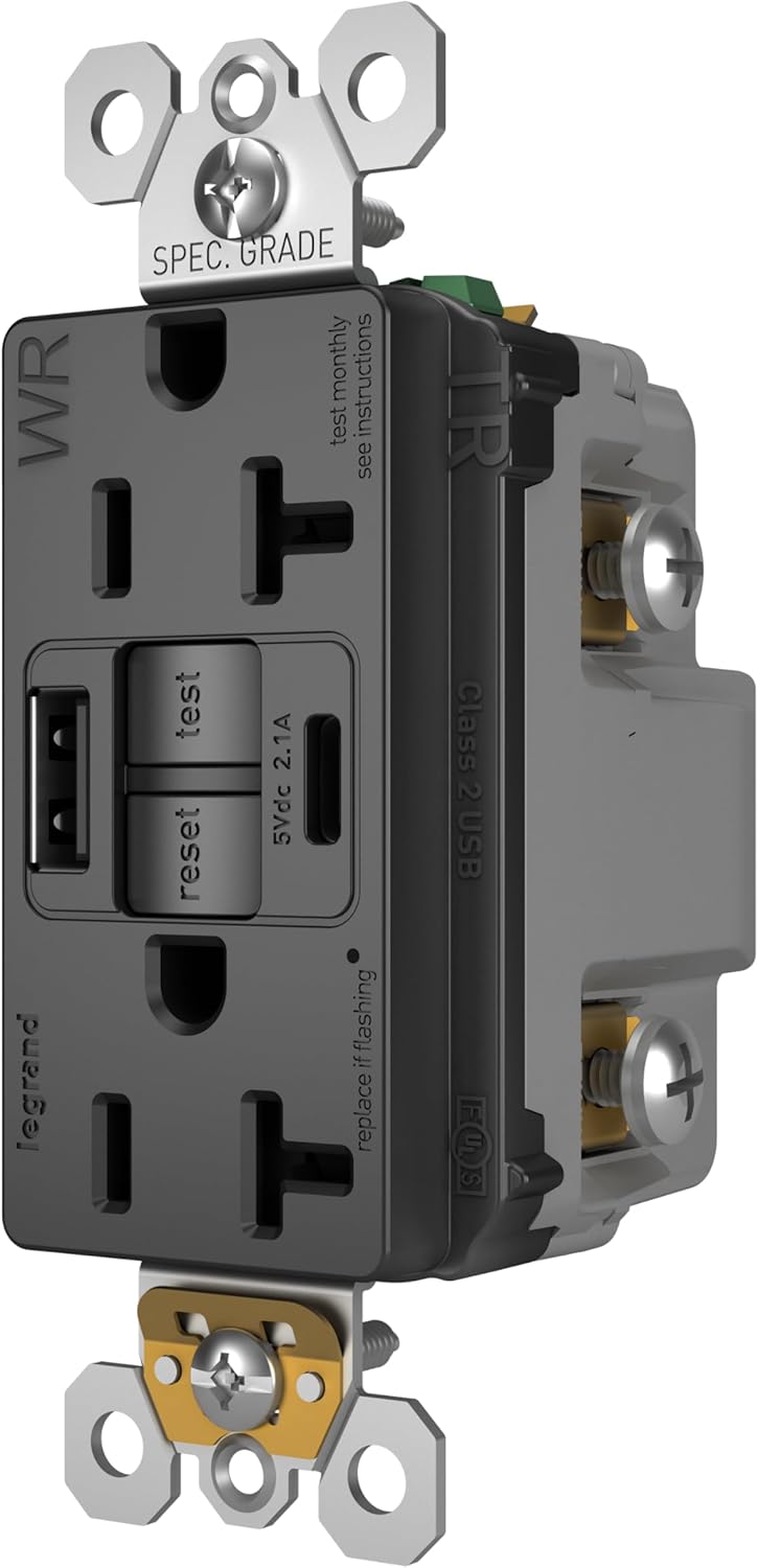 Provide superior safety and the convenience of built-in USB charging with this first-of-its-kind outlet. This electric outlet with USB ports is perfect for adding modern connectivity anywhere desired, even in the areas of hospital and healthcare facilities where ground fault protection is required. This Legrand Radiant outlet makes it easy to see and reset electrical trips right where they happen while also providing two USB A/C outlet plugs for keeping phones or tablets charged, no bulky adapter necessary. Made exclusively for use with screwless Wall Plates from the Radiant Registered Collection, sold separately.