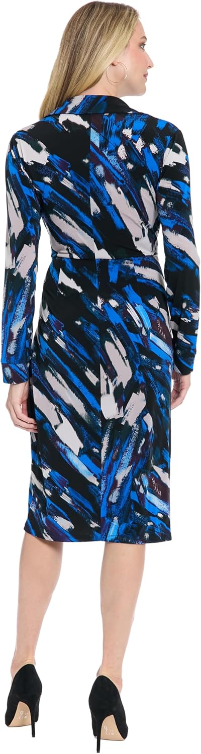 Elevate your professional wardrobe with this sophisticated wrap dress featuring a flattering V-neckline and long sleeves. The geometric print adds visual interest while the knee-length silhouette creates a polished, confident look perfect for boardroom meetings or evening events.