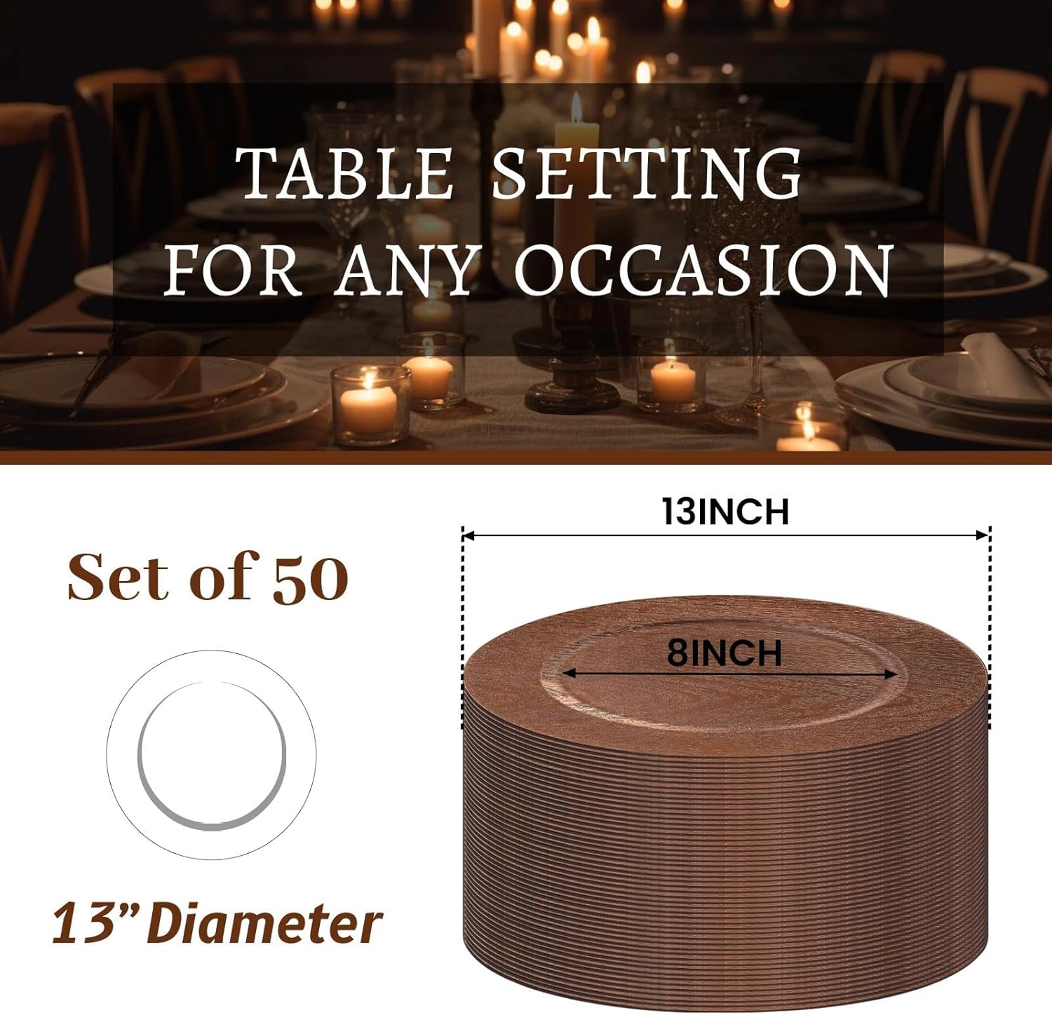 These elegant round chargers add sophistication to any table setting while the beautiful appearance gives off a glamorous feel. Whether serving as flatware or table decorations, our charger plates are a wonderful addition to your table settingFeatures:The charger plates bulk wedding with a 8" inner diameter, can fit under salad plates, soup bowls and dinner plates to protect your table from spills and heat marks. You can create attractive party centerpieces and decorations with these decorative charger plates. Suitable for numerous occasions including weddings, anniversaries or formal dinners. Adding the plate chargers bulk wedding to your serving style will upgrade any dining experience. Recommend washing these decorative plates by hand and wipe them with a dry cloth. Please not use for microwave or dishwasher, and Dont in direct contact with food. Product Information:Material: Plastic Color: Brown Shape: Round Diameter: 13 inches Inner Diameter: 8 inches Quantity: 50PC