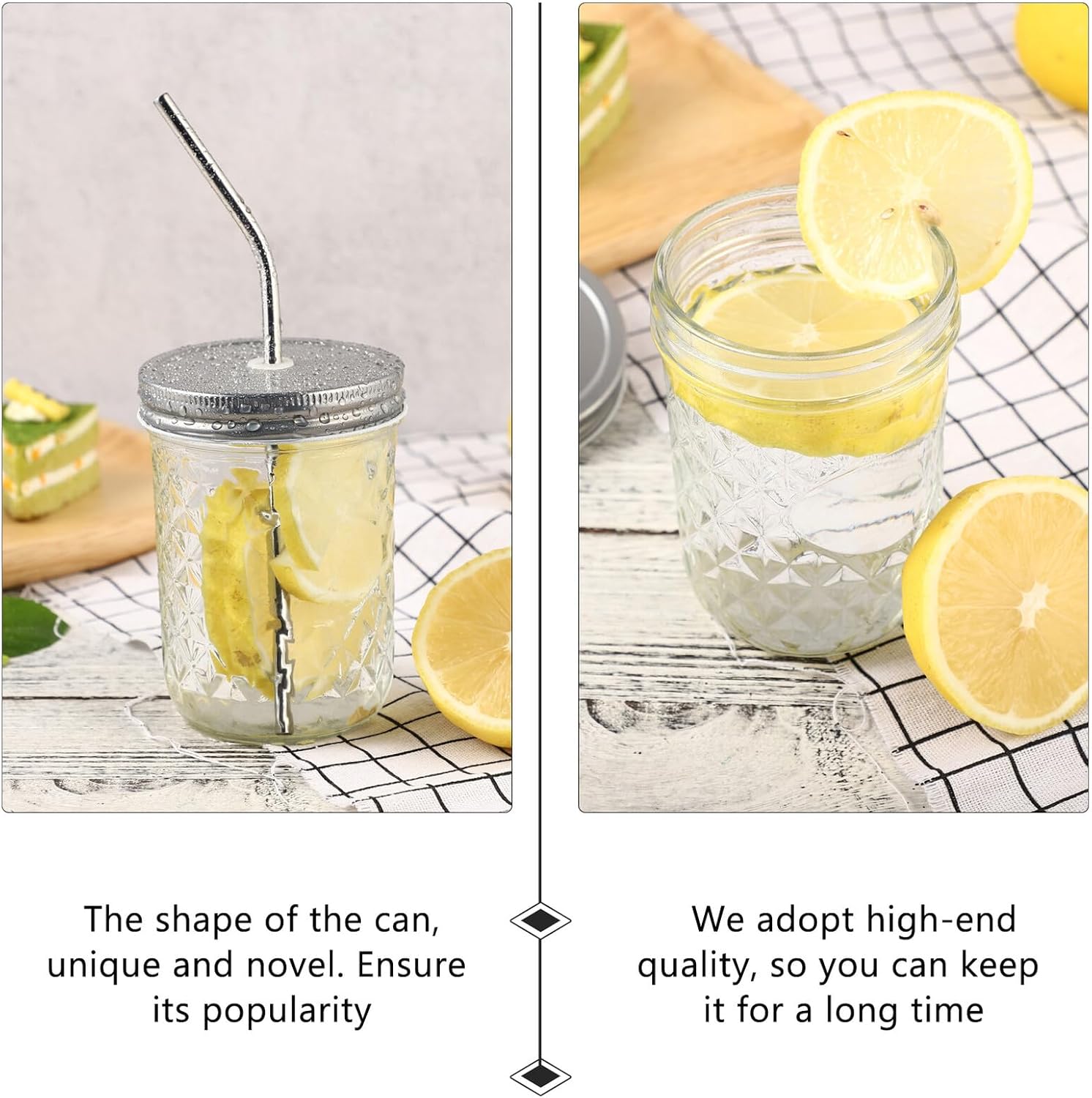 Package List 4 x jars 4 x straws Features -Color: Transparent. -Size: About 12.00X8.50X8.50cm/4.72X3.34X3.34inch. -Product Info:Straw Mason Can -Material: Glass, Stainless Steel. - Suitable for many occasions, such as home, office, restaurant and mason jars. - Made of glass material for lasting use. bottles for storing food. - Wide application range, can be used for storage or decoration mason jar with straw. - Come with premium cover, nicely seal, protects your food and keep fresh mason jars. - They can be used for storing juice, milk, cold and hot drink, water and more mason juice jars.Goods Informationmason jar with straw Comes with straw, more convenient to use.juice mason jars The lid is expertly designed with ease of use and storage security in mind; the included lids seal tightly to prevent leaks and preserve foods while still being easy to open and close.mason jar 500ml transparent jars, which are manufactured with that can be used for a long term