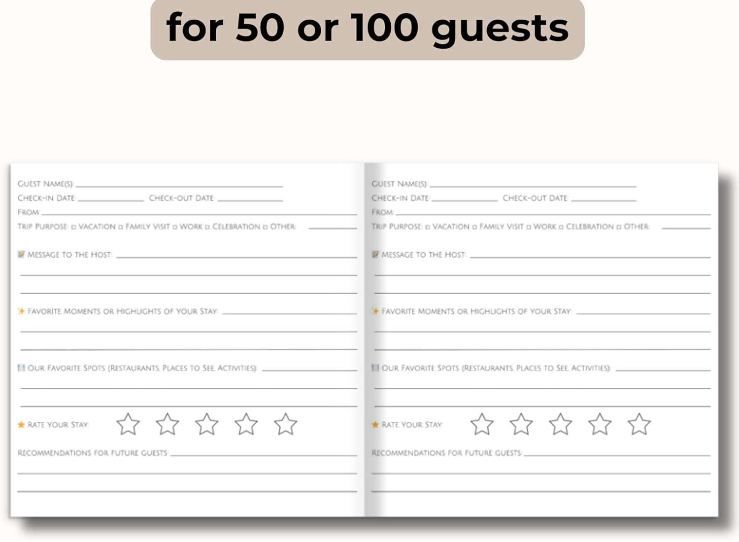 This personalized mountain cabin guest book is designed to capture the memories and experiences of your visitors. The cover can be customized with your cabin’s name, making it a unique centerpiece for your vacation home or rental. Available in two versions for 50 or 100 guests, each page includes prompts for guest names, stay dates, highlights from their visit, and recommendations for future visitors. Printed on thick, high-quality paper and bound in a sturdy hardcover, it’s built to last and withstand frequent use. Perfect for mountain cabins, Airbnb rentals, or vacation homes, this guest book preserves valuable feedback and stories, creating a meaningful record for both hosts and guests to enjoy.
