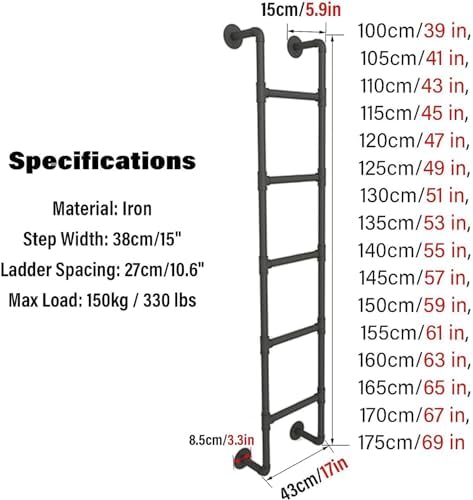 Introducing our versatile and durable loft bed ladder, designed to enhance your living space! This expandable ladder features a hook style, making it easy to use without the need for jumping in or out of bed. Perfect for various settings such as RVs, school dorm rooms, and children's bedrooms, it caters to all your climbing needs. **Specifications:** - Color: Black - Material: Iron - Step Width: 15 inches (38 cm) - Ladder Spacing: 10 inches (25 cm) - Wall Diameter: 5.9 inches (15 cm) - Base Diameter: 3.3 inches (8.5 cm) - Maximum Carrying Capacity: 330 lbs (150 kg) **Key Advantages:** 1. **Strong Yet Lightweight:** Crafted from robust iron, this ladder combines strength with portability, making it easy to reposition as needed. 2. **Safety First:** Equipped with anti-slip pedals, it ensures a secure grip for safe climbing, providing peace of mind for you and your family. 3. **Ideal for Various Applications:** Whether you're in a caravan, camper trailer, or motorhome, this ladder is a practical solution for accessing elevated spaces. **Usage Tips:** 1. Measure the bed height to ensure proper fit. 2. Assess the bedside width for optimal placement. 3. Consider the incline of the ladder for comfortable use. **Easy Maintenance:** Keep your ladder looking fresh by simply wiping it down with a clean, soft cloth. **Please Note:** Manual measurements may vary slightly by 1-3 cm, and we appreciate your understanding. **Package Includes:** 1 x Ladder Elevate your space and enhance functionality with our loft bed ladder today!