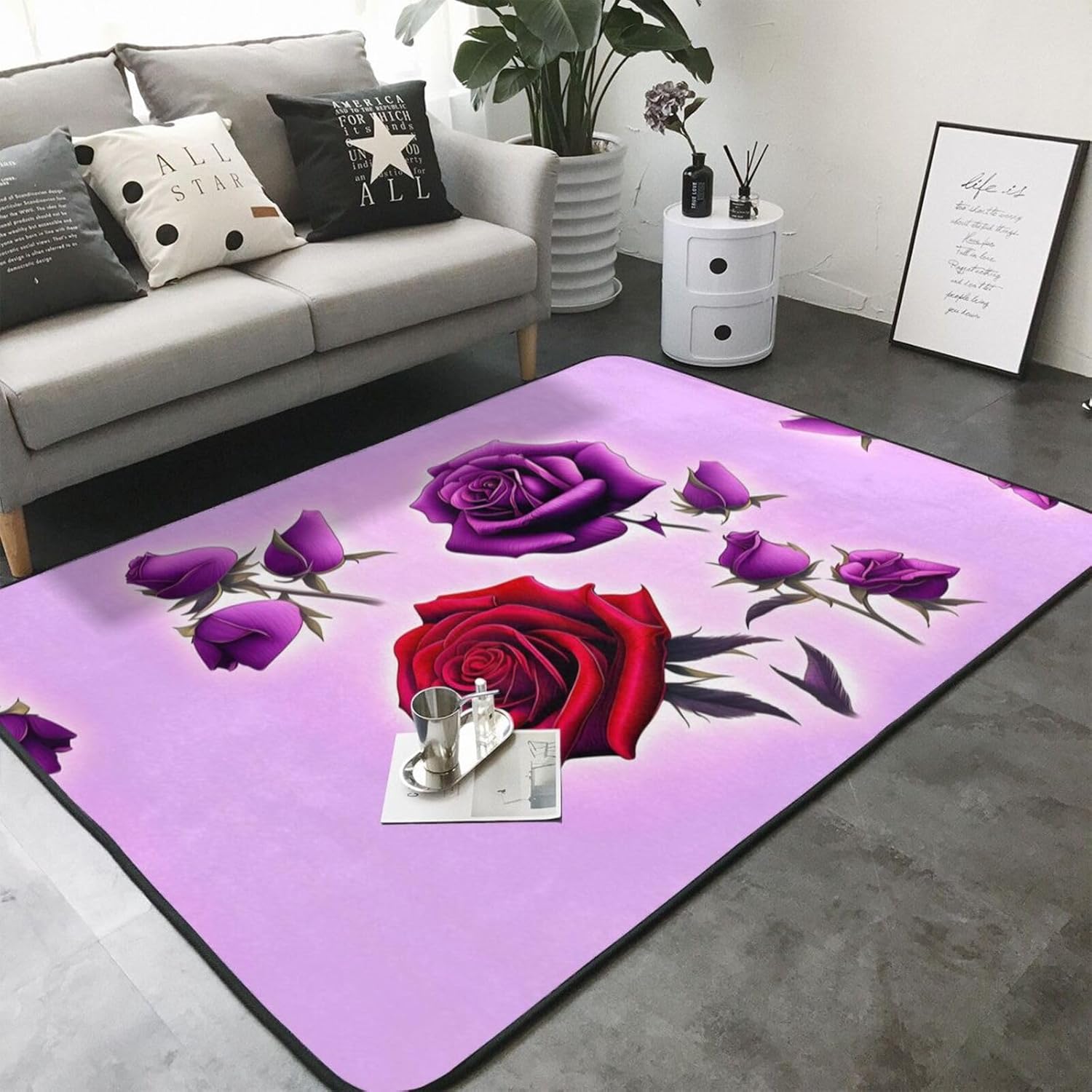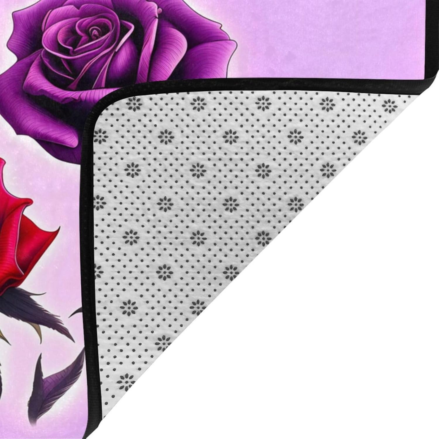 This Red and purple roses printed decorative carpet is made of polyester flannel, which is delicate and soft to the touch, with tight and regular pile. It will not pill or fade after long-term use, and will always look like new. The middle layer uses high-density memory foam, which can automatically adjust according to the foot shape and pressure, providing precise massage for tired feet and relieving fatigue. The bottom is designed with non-slip plastic bottom non-woven fabric, which can firmly grip the ground even when it encounters water or on smooth surfaces, ensuring the safety of the elderly and children. It is easy to clean daily, can be machine washed or hand washed, and is wear-resistant and does not shed. Exquisite stitching technology and high-quality tailoring, with smooth edges, are suitable for a variety of scenes such as bathrooms, living rooms, and bedrooms. Non-slip, comfortable, and durable, adding a touch of intimacy and elegance to your life.