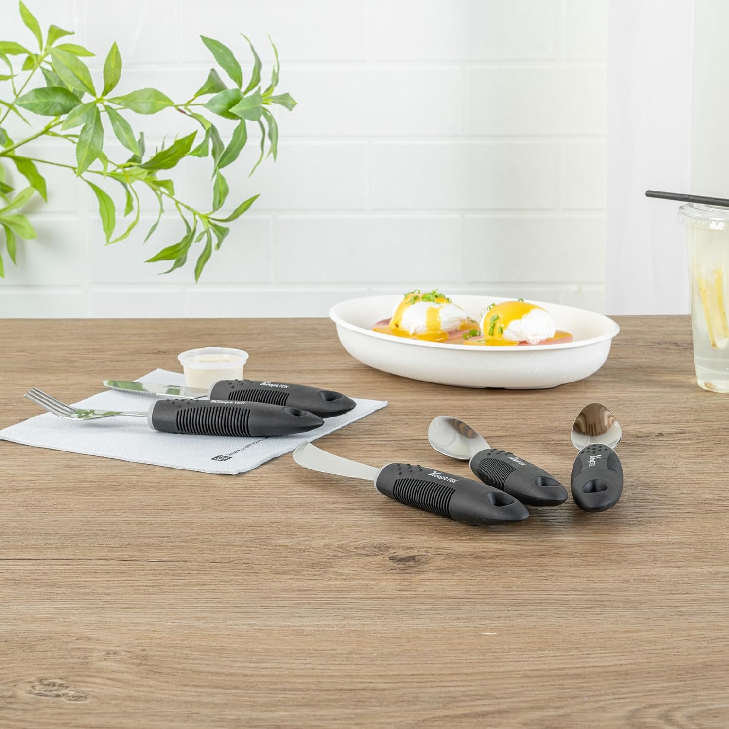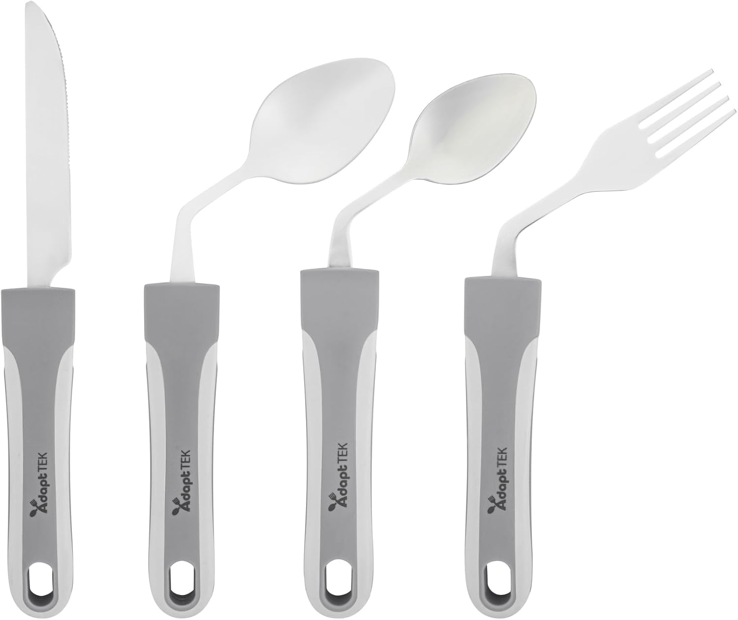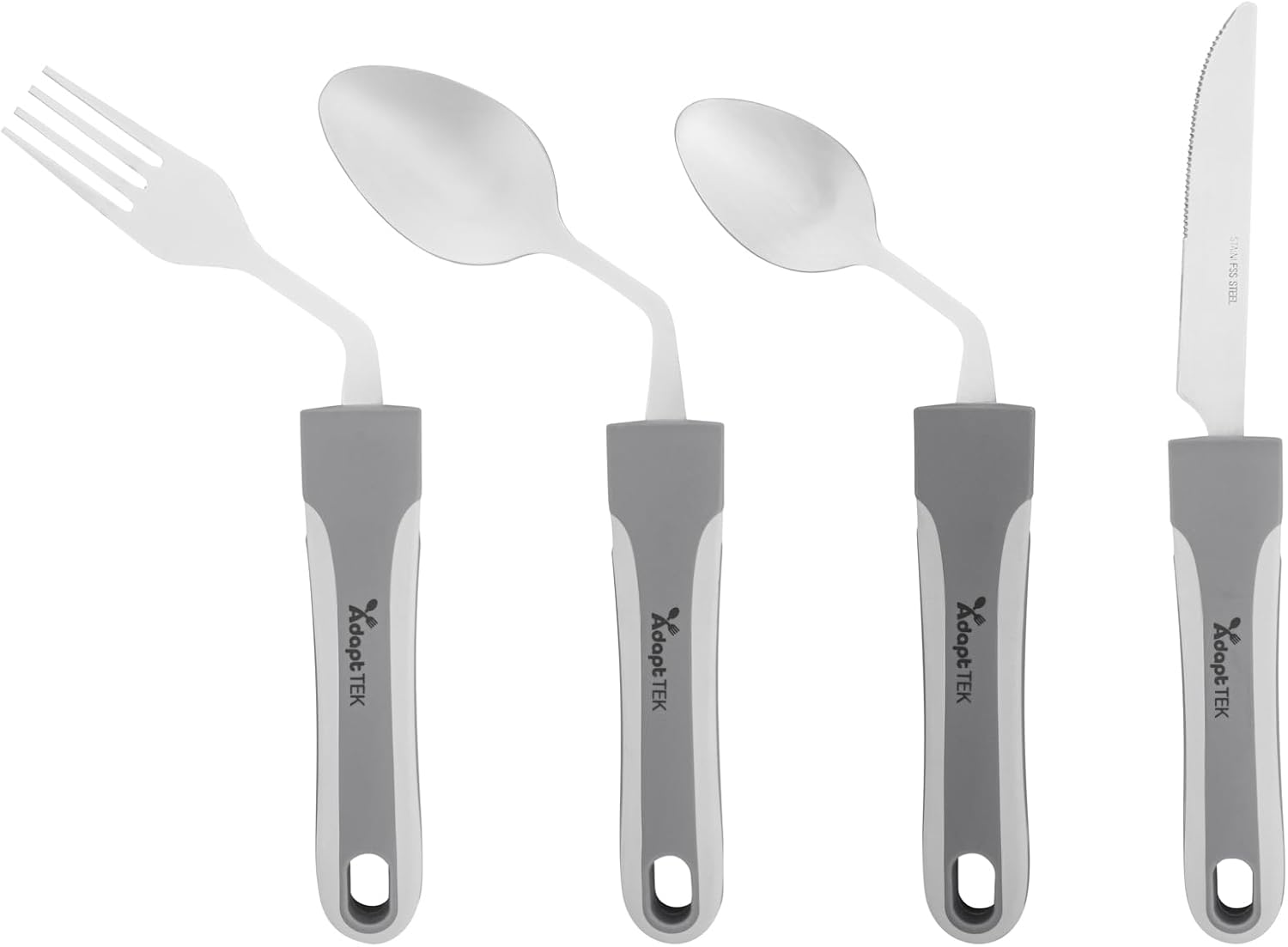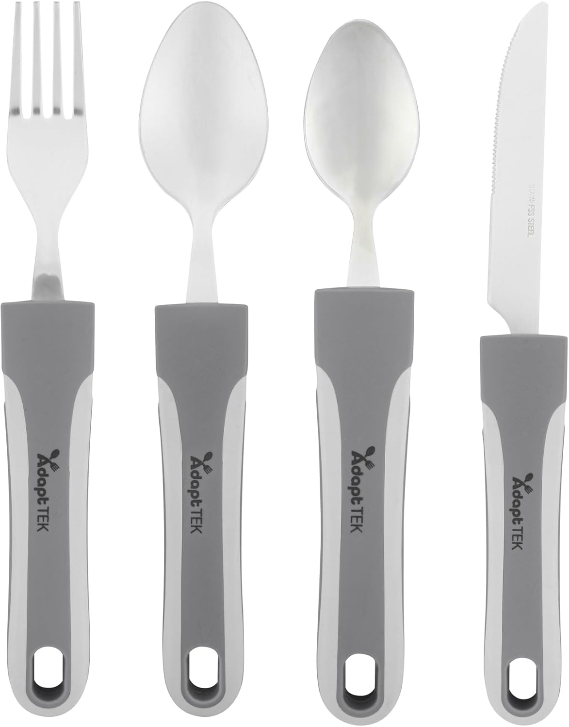 Enhance dining experiences with utensils that empower independence. Adapt Tek Non-Slip Stainless Steel Adaptive Kitchen Utensils feature a non-weighted design, providing effortless control and reducing strain for users with weak grip or tremors. This adaptive kitchen utensils set includes a non-slip surface, ensuring stability during service and making it ideal for healthcare institutions and assisted living facilities. Constructed from durable stainless steel, these utensils are suitable for both hot and cold food applications, including freezer-safe use. The secure-grip design prevents accidental spills and drops, supporting individuals with limited dexterity, while the dishwasher-safe feature simplifies cleanup in busy foodservice settings. With dimensions of 9.84 inches in length, 5.12 inches in width, and 1.58 inches in height, this non-slip cutlery set provides the right tool for every meal. Equip your establishment with this reliable spoon fork knife set to enhance operational efficiency and dining satisfaction. Each order includes 1 Adapt Tek Non-Slip Stainless Steel Adaptive Kitchen Utensils.