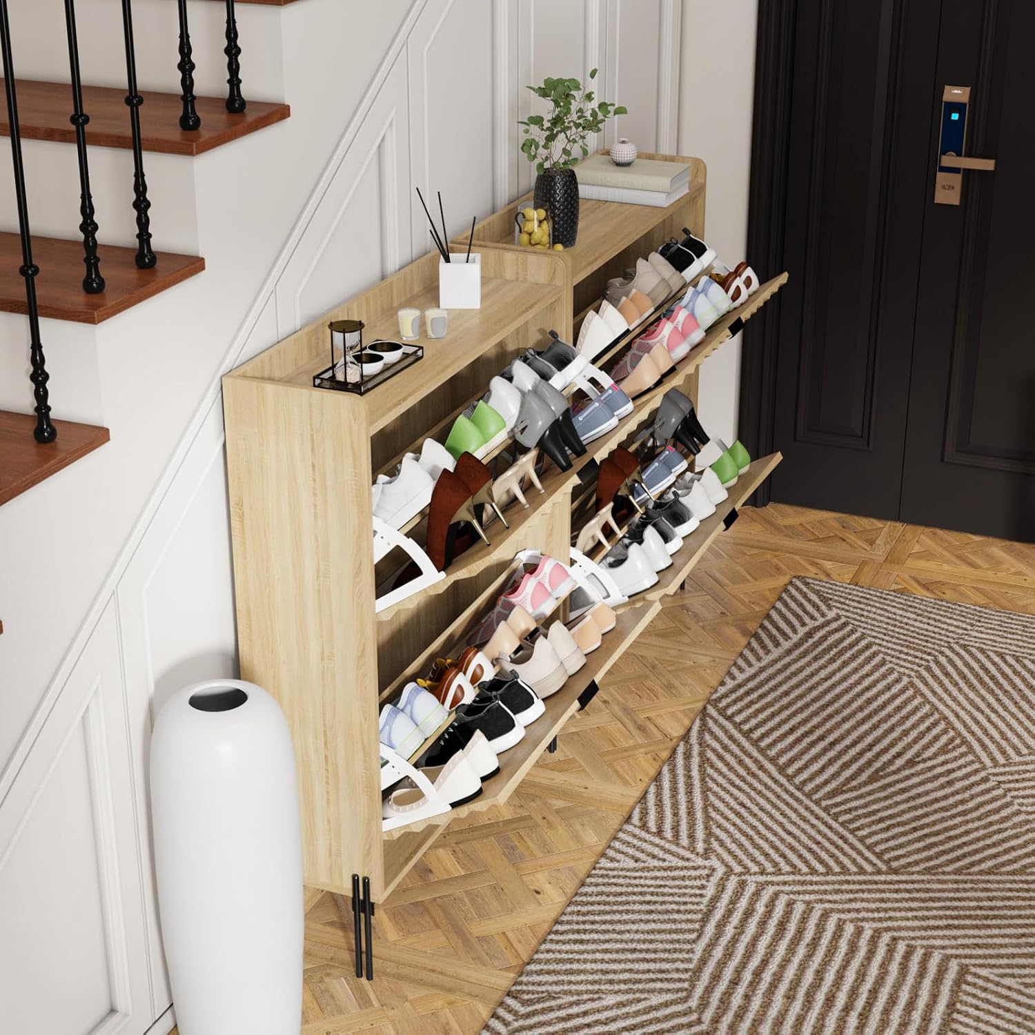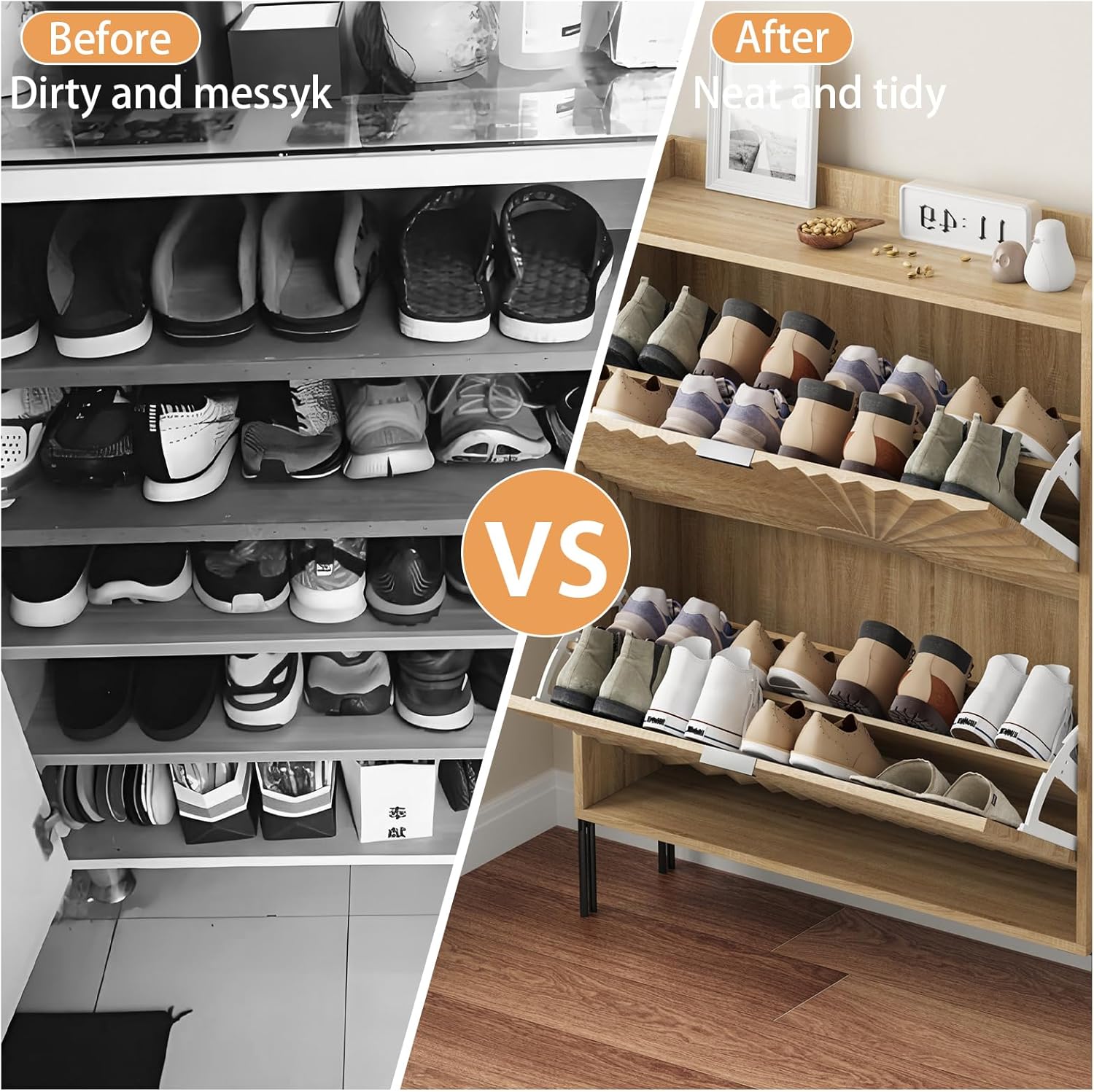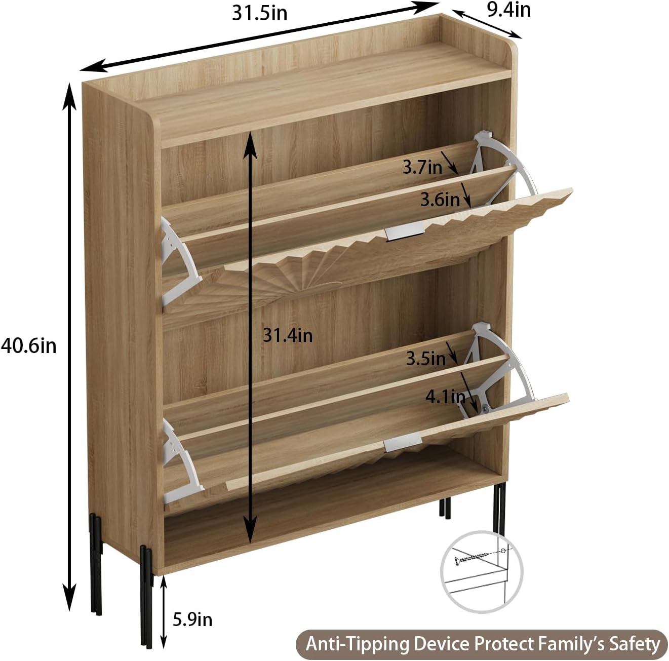 Transform your entryway with our elegant entryway shoe rack,designed to maximize space and minimize clutter. Product Design:This fluted shoe cabinet boasts a modern aesthetic with its unique textured surface.The sophisticated slim shoe cabinet for entryway design,accented with sleek metal handles,elevates it from a simple functional item to a stylish piece of home decor. Size:Engineered for narrow spaces,this slim shoe cabinet features compact dimensions that fit perfectly in tight corners,hallways,or small apartments,making it the ideal space-saving entry way shoe storage cabinet. Material:Constructed for lasting use,the main body of this shoe cabinet storage for entryway is complemented by sturdy metal components in its legs and hardware,ensuring reliable support and a contemporary finish. Features:As a versatile shoe organizer for entryway,it includes innovative flip-up drawers and an adjustable interior panel to accommodate various footwear.The top surface of this shoe cabinet storage unit also doubles as a stable shelf for daily essentials. Occasion:Perfect for any home,this shoe cabinet serves as your go-to organization hub for storing shoes,bags,and more,keeping your entrance tidy for both daily life and welcoming guests. Upgrade your home's first impression with this chic and highly functional shoe cabinet storage centerpiece.