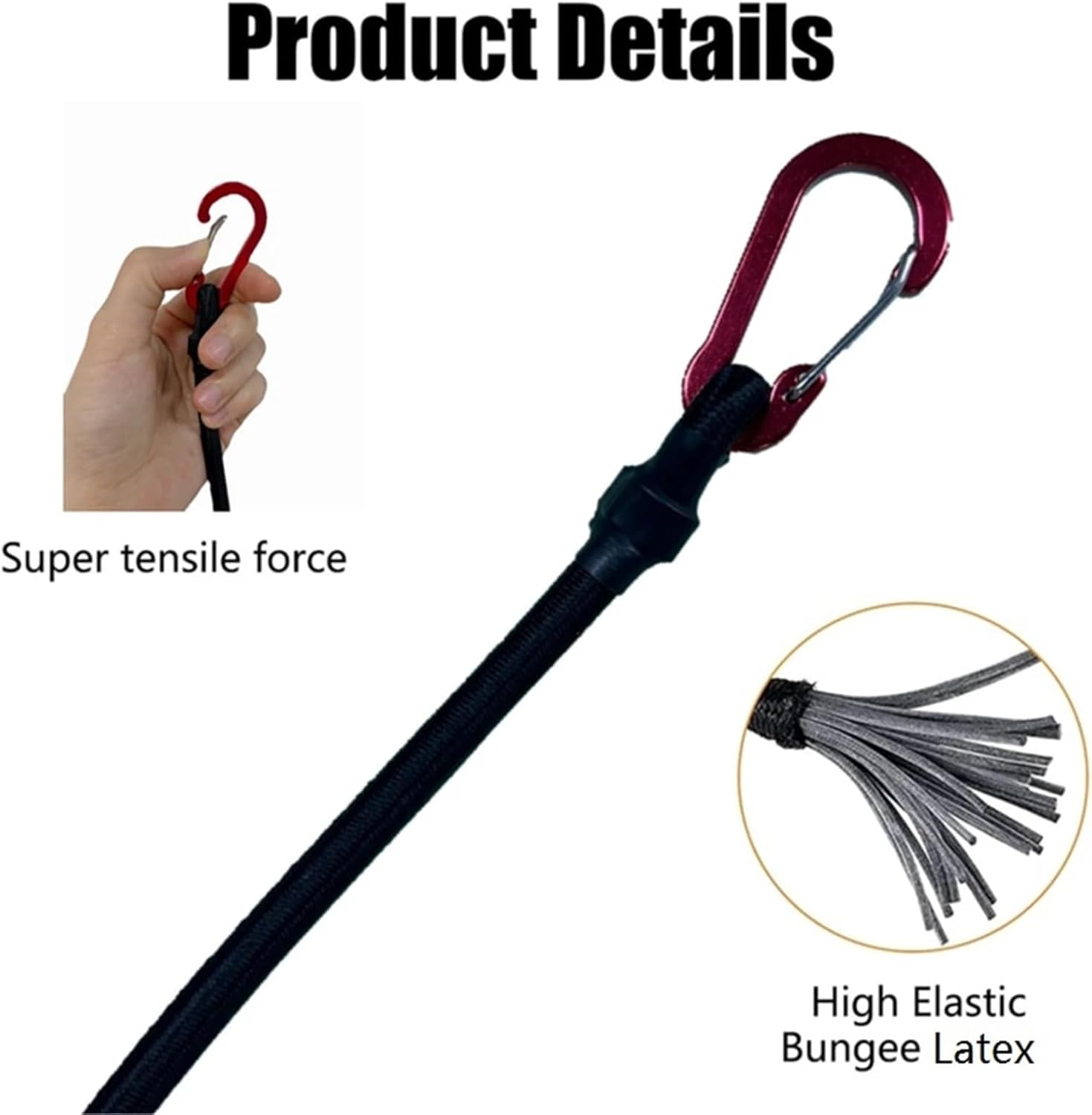 1. Material: Latex + Aluminum2. Size: 30cm/11.8in, 60cm/23.6in, 90cm/35.4in, 120cm/47.2in, 150cm/59in, 180cm/70.87in, 210cm/82.68in3. Rope Diameter: Approx. 8mm/0.31in4. Color: BlackPackage List4 x Bungee CordNotes: 1. There may be slight size deviations due to manual measurement, different measuring methods and tools. 2. The picture may not reflect the actual color of the item because of different photographing light, angle and display monitor.