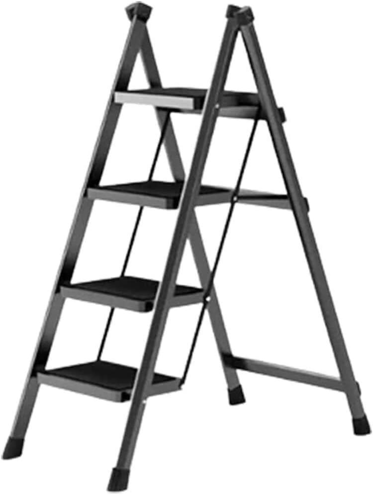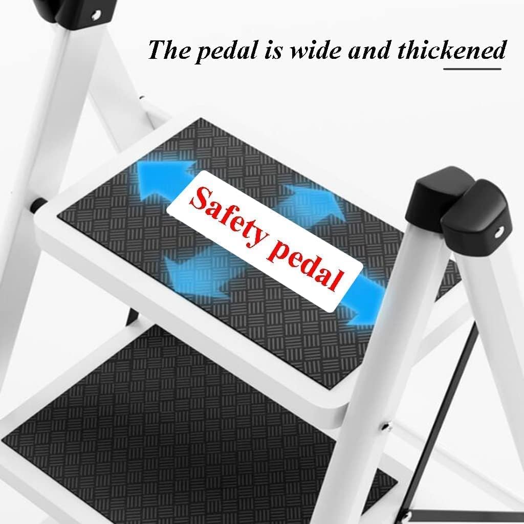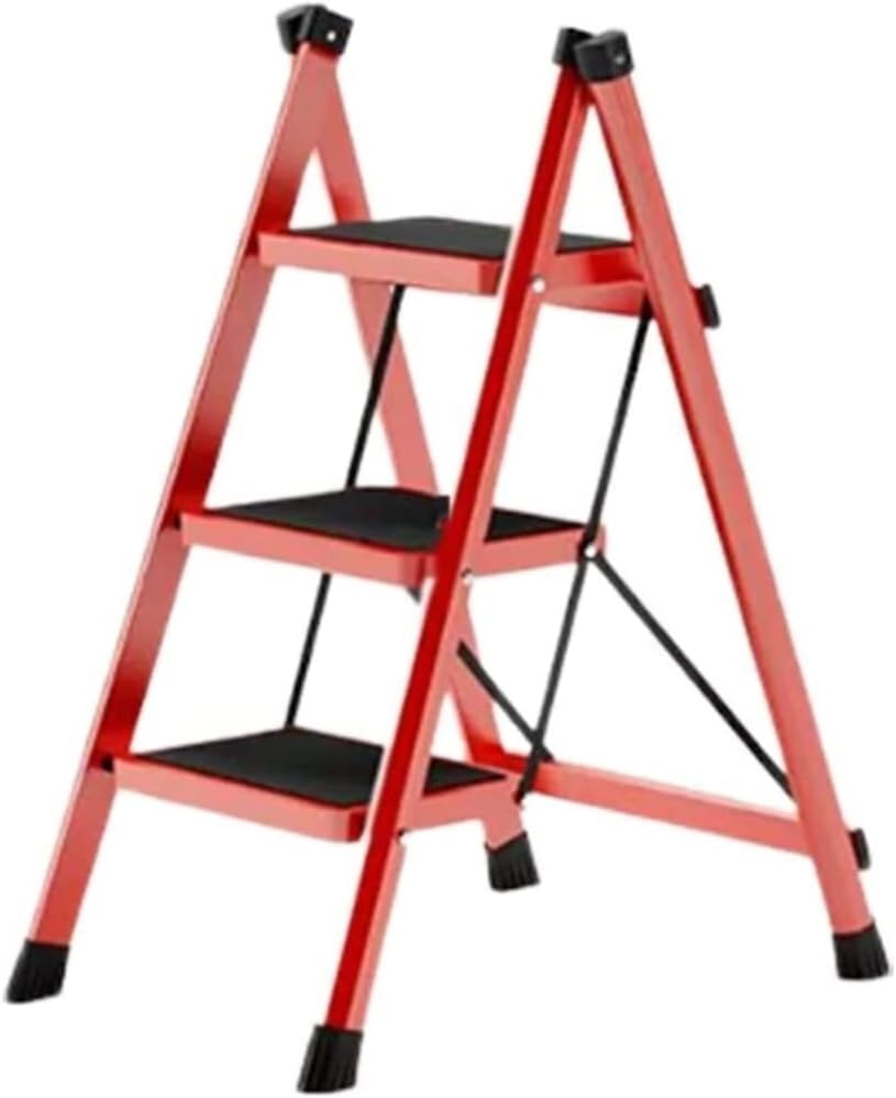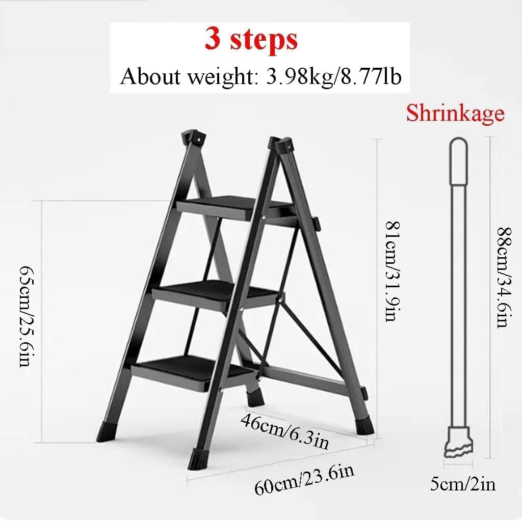 Easy Storage with Compact Design: The step ladder can be folded, quite portable & space-saving for storage. It's portable in your car trunk, or can be carried everywhere. Compact enough to slide under a bed, stash in a closet / behind a door, or simply lean against a wall.Ladder Type:Telescoping Ladders/Folding Ladder/Step Ladders product material: carbon steelProduct color black white, red, blueProduct size: 5 Step: Expanded size: 50*82*131cm; Folded size: 50*5*137cm4 Step: Expanded size: 49*65*107cm; Folded size: 49*5*113cm3 Step: Expanded size: 46*60*81cm; Folded size: 46*5*88cm2 Step: Expanded size: 46*47*58cm; Folded size: 46*5*64cmProduct load: 330lb/150kgSpecification type: folding ladderWide Range:for home, attic, RV, outdoor work, building maintenance, window cleaning, decoration workPackage Included:1 x Ladder (excluding any products)Wide Application:This ladder is a must-have for cleaning, painting, decorating, and all your DIY projects, it allows you to effortlessly reach those hard-to-access areas, perfect for home offices and both indoor and outdoor use, it takes the hassle out of your DIY or cleaning tasks, with this ladder, you can easily complete your projects.