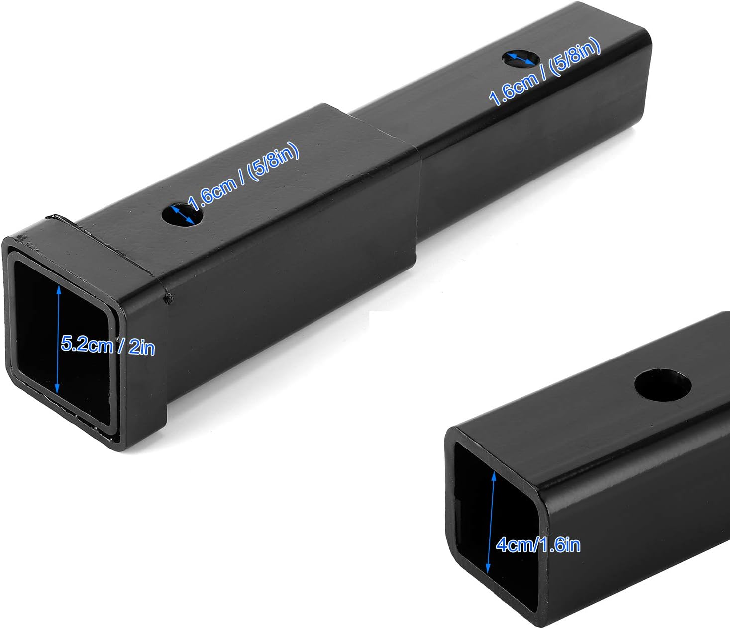 1. [PREMIUM STEEL CONSTRUCTION] Made of high-quality steel for excellent safety and erosion resistance, ensuring durability. 2. [500LBS TOWING CAPACITY] Black powder coat finished with a 500lbs TW capacity, ideal for various towing needs. 3. [VERSATILE USE] Compatible with class 3 or 4 hitch receivers, great for trailers, bike racks, and cargo carriers. 4. [EASY INSTALLATION] Just slide into your existing hitch receiver and secure with a 5/8in hitch pin kit or lock. 5. [COMPACT DESIGN] With an overall length of 13", this extender is perfect for clearing spare tires and adding extra parts to your hitch. Specification: Item Type: Towing Extender Material: Steel(2in and 2-3/8in steel square tube) Overall Length: Approx. 33cm/13.0in Wall Thickness: Approx. 0.235in Distance between 2 Pin Hole Ceter: Approx. 20.5cm/8.1in Capacity: Gross Tongue Weight is Restricted to 500lbs Maximum Pin Hole Size: Approx. 5/8in Package List: 1 x Towing Extender