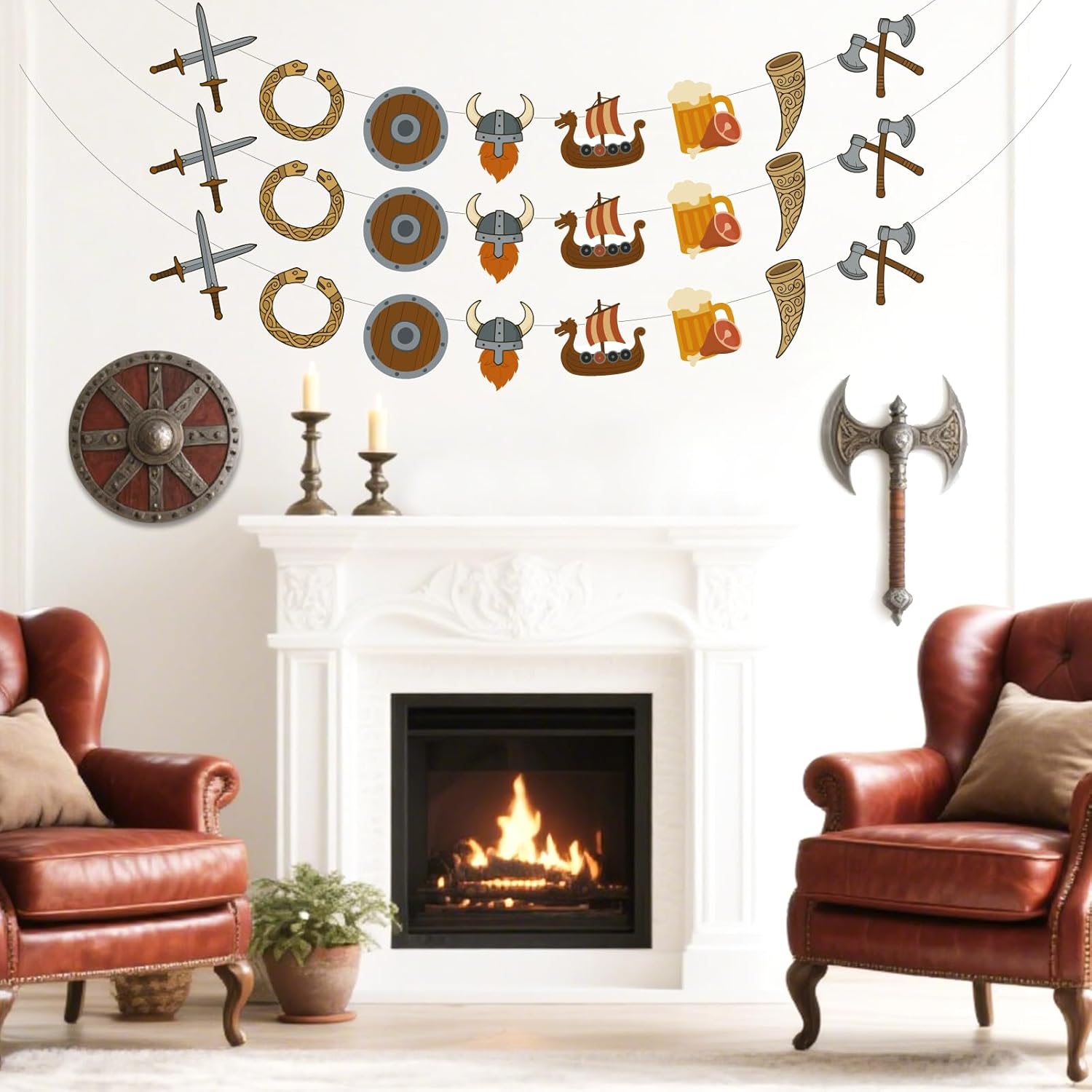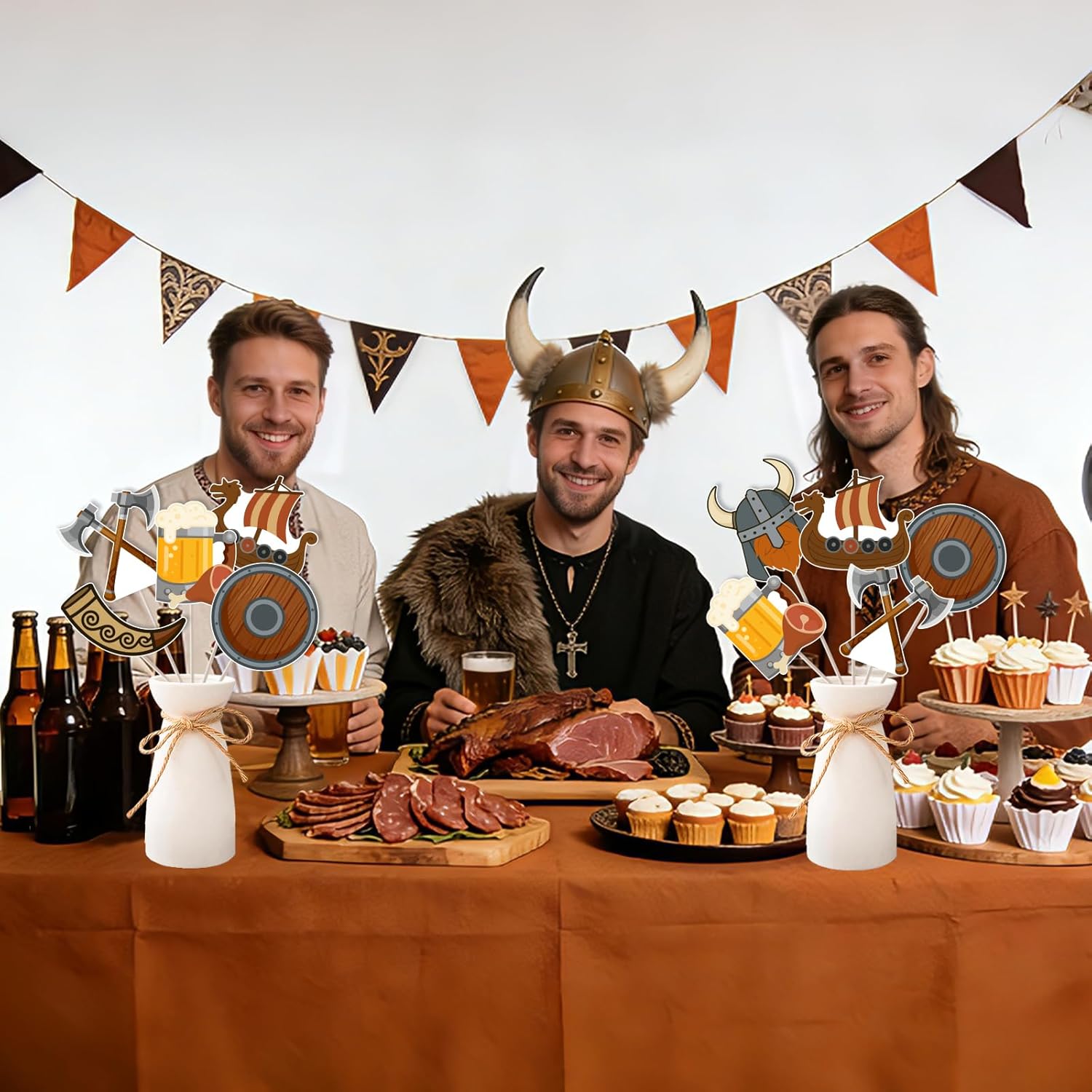 Package Includes: 3 x Viking banner 24 x hanging swirl streamers 24 x centerpieces sticks Color: brown Occasions: party