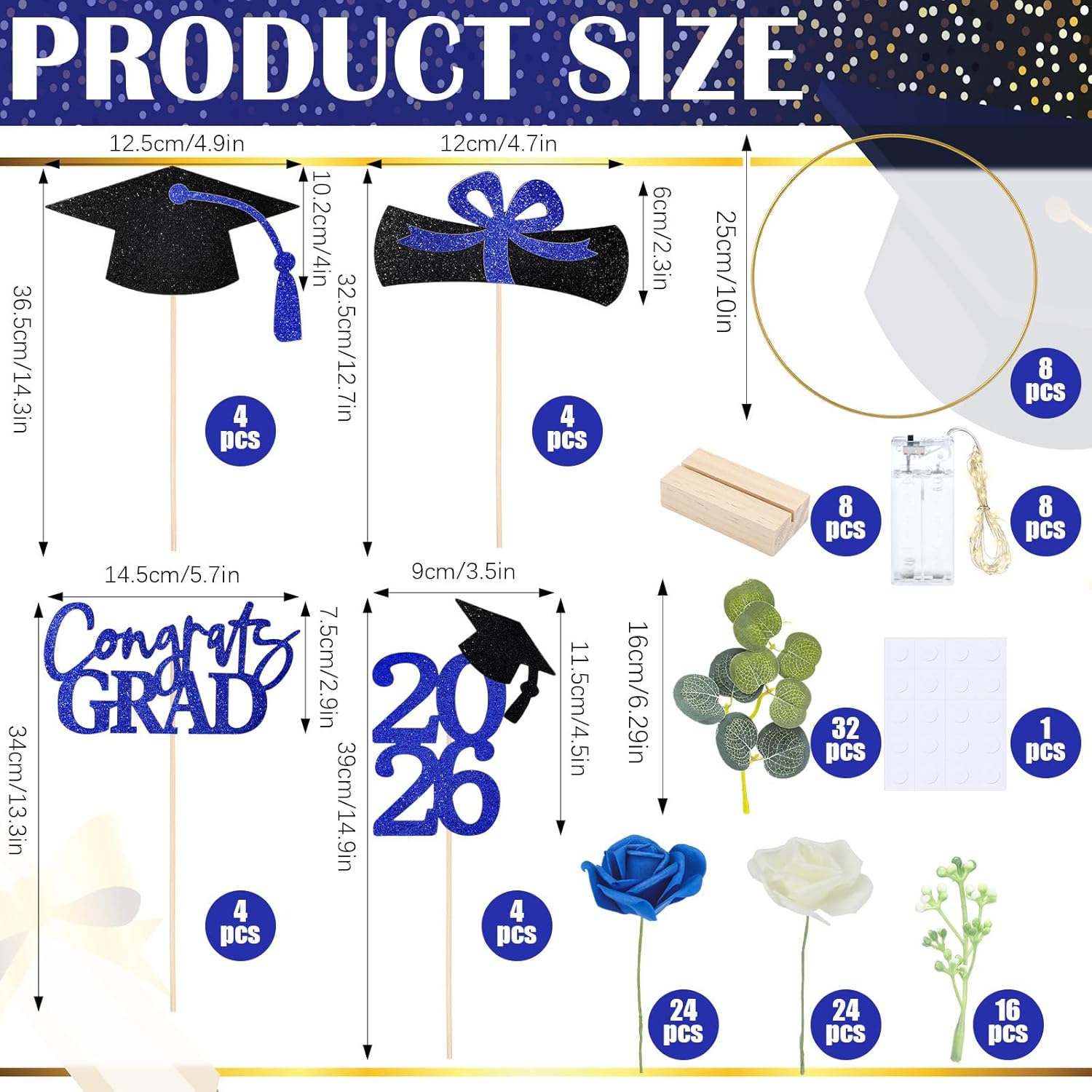 Features: Easy to Assemble: The metal golden hoops, wooden base, and flowers in the set are all individual components. Simply insert or easily secure them to complete the arrangement. No professional tools are required, making it easy for beginners to quickly create a neat and beautiful table decoration Reusable: The metal golden hoops, wooden base, and artificial flowers are all durable and can be easily disassembled and stored after use for future parties or holiday decorations. Economical, and avoiding waste Specifications: Color: multicolor Size Metal golden hoop: 3 mm thick and 10 inches in diameter Wooden stand: about 0.71 x 2.76 x 1.38 inches/ 1.8 x 7 x 3.5 cm Warm white string lights: about 39.37 inches/ 1 m Package includes: 8 x Wooden stands 8 x Metal golden hoops 48 x Artificial roses 48 X Artificial leaves 16 X Graduation toppers 1 X Warm white string lights Notes: Manual measurement, please allow slight errors on size. The color may exist a slight difference due to different screen displays