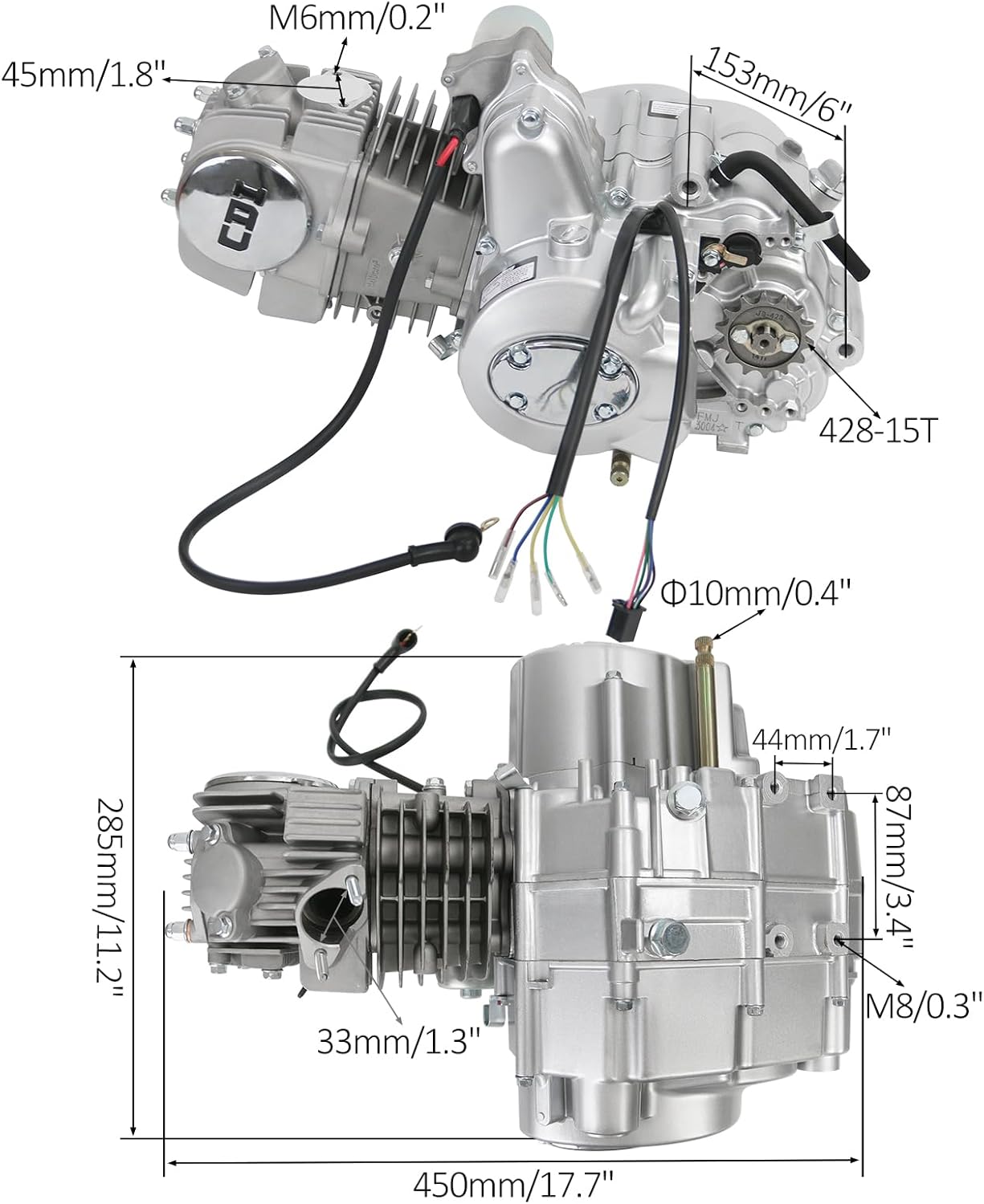 4 Stroke 140cc ENGINEDescription Type: 1-cylinder, horizontal, 4-stroke, air cooled electric start, Gear: 3 speed with reverse Bore x Stroke: 56mm x 57mm Max. Power & Corresponding Speed: 7kw/[8500(1±5%)]r/min Max. Torque & Corresponding Speed: 9.5N.M/[5500(1±5%)]r/min Min. unload idling speed: 1500±150 r/min Start Mode: electric start ( on upper position) and kick start Stroke volume : 140ml Compression: 8.8:1 Engine Oil: 900ml, 15W/40W-SE, 4 stroke Semi Auto Clutch SPROCKET: 14T 428 17mm Valve clearance: 0.05±0.02 Primary ratio: 3.722 Transmission ratio: 3.822Gear ratios for each gear: 1st: 3.272, 2nd: 1.937, 3rd: 1.350, 4th: 1.043LISTING INCLUDING 1 x 140CC ENGINE 1 x Gear Shift Lever 1 x Manifold set Package 1 x Engine Cover