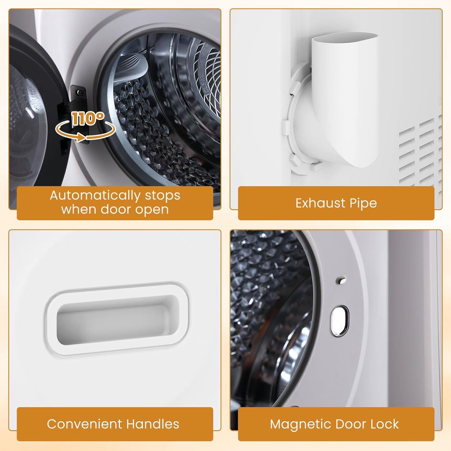 Description: Discover the ultimate in convenient drying with our 850W portable clothes dryer. Swiftly dry your laundry, even on the dampest days, thanks to an innovative drum function and flexible drying modes: Cooling, Anti-wrinkle, Standard, and Bulky, plus a Refresh. Effortless operation with easy knob control lets you choose settings for your needs. Keep an eye on your clothes through the clear window and enjoy easy access with a wide door. Compact and lightweight, this dryer fits seamlessly into your space, whether perched on a countertop or mounted on a wall. Feature: Achieve rapid drying with our high-power 850W system Experience even heat distribution from the innovative back-and-forth drum. Select from four convenient modes: Cooling, Anti-wrinkle, Standard, and Bulky. Utilize the Refresh function to accommodate all your drying needs. Adjust effortlessly with simple knob controls Monitor your laundry through a convenient transparent window. Enjoy easy access with a wide 110° door opening for hassle-free loading. Capture lint and pet hair effectively with the multi-filtration system. Ensure safety as the dryer stops if the door is opened. Fit this compact, lightweight dryer into any small space effortlessly. Specifications: 1. Voltage: 120V/60Hz/850W 2. Dimensions: 19"L x 15.8"D x 22"H 3. Weight: 32 lbs 4. Material: ABS Body, Stainless Steel Drum Package Includes: 1 x Dryer Machine 1 x Vent Connector 1 x Use Manual