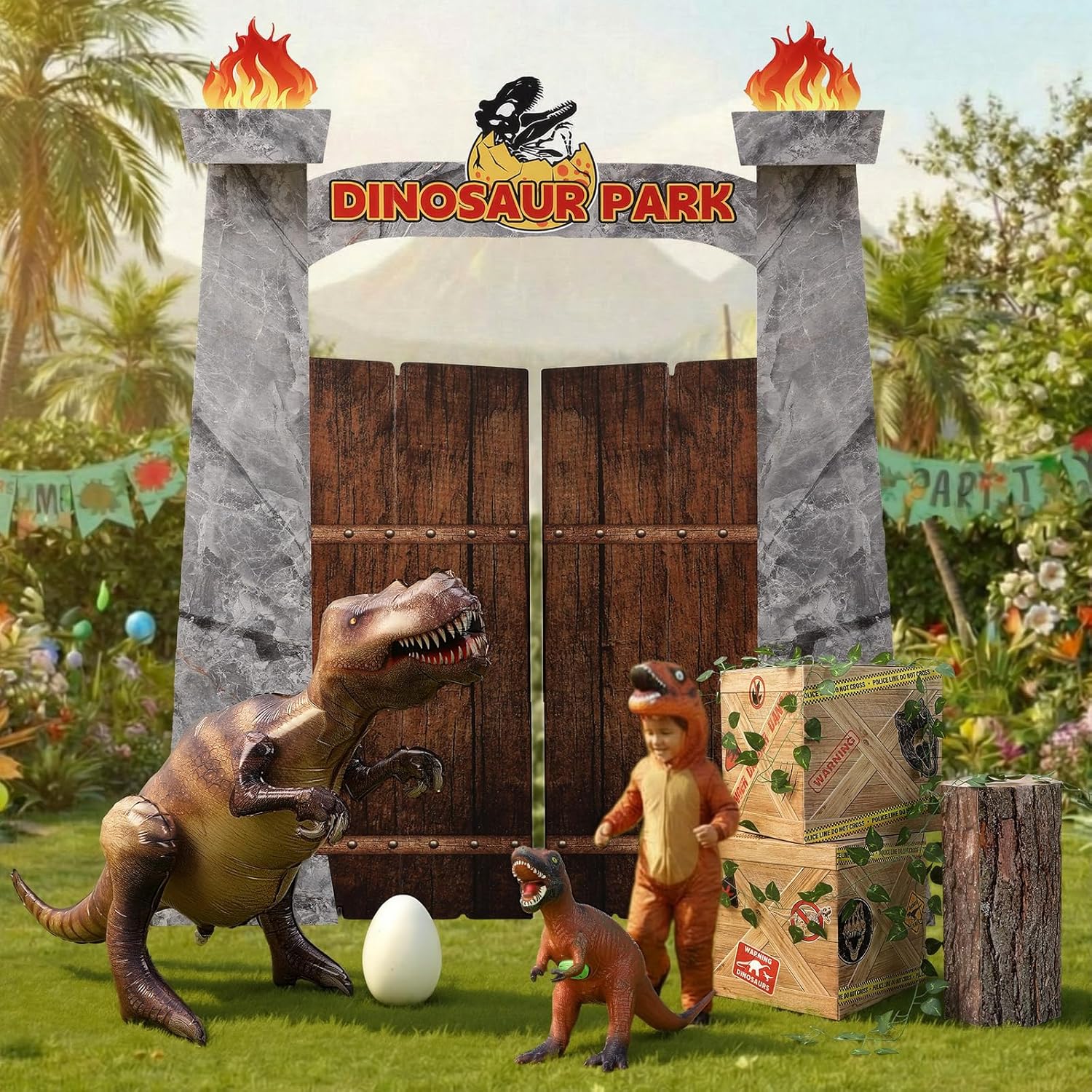 Features: Nice Quality: The dinosaur-themed decorations are made of quality cardboard, featuring high longevity and no damage, and support repeated recycling and use. Easy to Assemble: The dinosaur boxes come pre-folded in one pack. They can be easily assembled according to the picture instructions (or product videos) and can be completed in just a few minutes. Specifications: Material: plastic, hollow board, aluminum film, foam Color: multicolor Size: Dinosaur box: about 12x 12 x 12 inches/ 30 x 30 x 30 cm (LxWxH) Wooden stake: about 7.87 x 7.87 x 15.75 inches/ 20 x 20 x 40 cm(LxWxH) Inflatable Dinosaur: about 35 x 47 inches/ 90 x 120 cm (LxH) 3D simulated dinosaur: about 20 inches/ 52 cm (H), Pothos leaves: about 6.89 ft/ 210 cm(L), Dinosaur eggs: about 5 x 3 inches/ 12 x 8.5 cm(LxH), Dinosaur gate: about 43 x 59 inches/ 110 x 150 cm(LxH) Package includes: 2 x Dinosaur boxes 1 x Wooden stake 1 x Inflatable dinosaur 1 X 3D simulated dinosaur, 2 x Pothos leaves, 1 x Dinosaur egg, 1 x Dinosaur gate Notes: Manual measurement, please allow slight errors on size. The color may exist a slight difference due to different screen displays