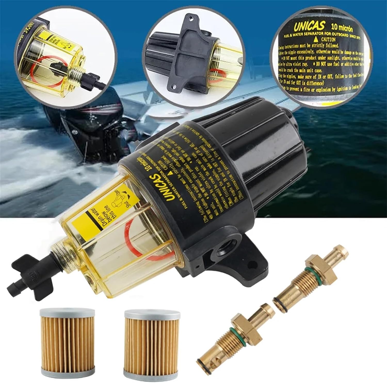 CablesFuel Filter UF-10K Water Separator Assembly with 2 Pcs Extra Filter Yacht boat diesel gasoline engine Outboard Motors Fuel TankFeatures:Removes 99.9% of water that may be present in the fuel tankEquipped with a transparent bowl with o-ring water level gauge lets you see at a glance how much water has been trapped by the filterEasy access drain valve allows you to drain all trapped water without having to remove the entire filterApproved for use with ethanol blended fuels, a common cause of water in fuelIncludes 10,30 , easy replacement filter elementIncludes Fuel line adapters, unlike other modelsHas a removable magnet (for cleaning) that reduces metal particulate in the fuelEasy installationCorrosion Measures 9" x 6" x 3.5"Item:Filter AssemblyMaterial: paperPart No.: UF-10KHeight: 85mmOD/Width Max: 210mmID/Depth Max:120mmPlace of Origin: CN