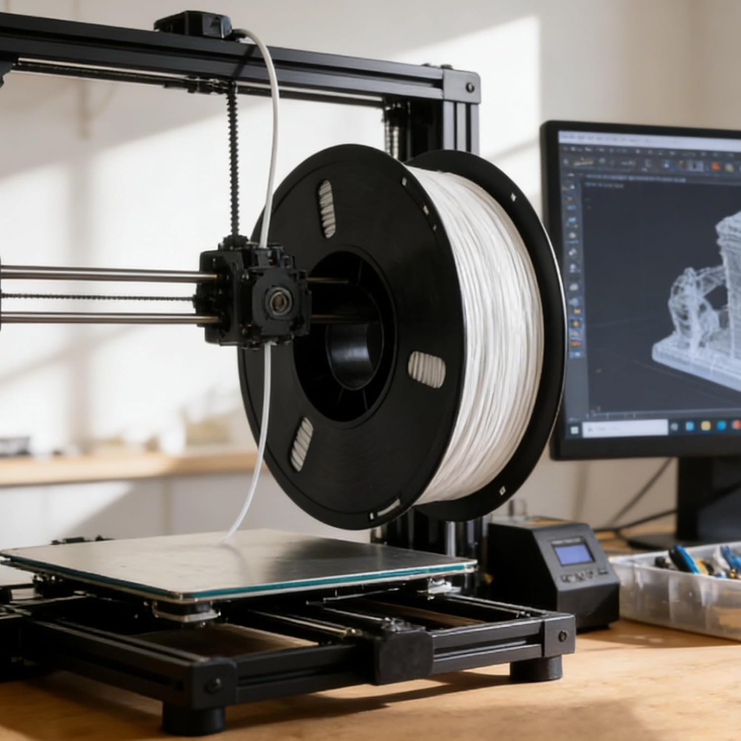 Color: White Material: PLA Size: Filament Package: 7.8 x 7.8 x 2.4 in / 19.8 x 19.8 x 6 cm Package Includes: 1 x 3D Printer Filament Note: - Please refer to the measurement. Tiny measuring error is allowable in normal range. - There might be a little color difference due to the monitor, camera or other factors, please refer to the physical item.