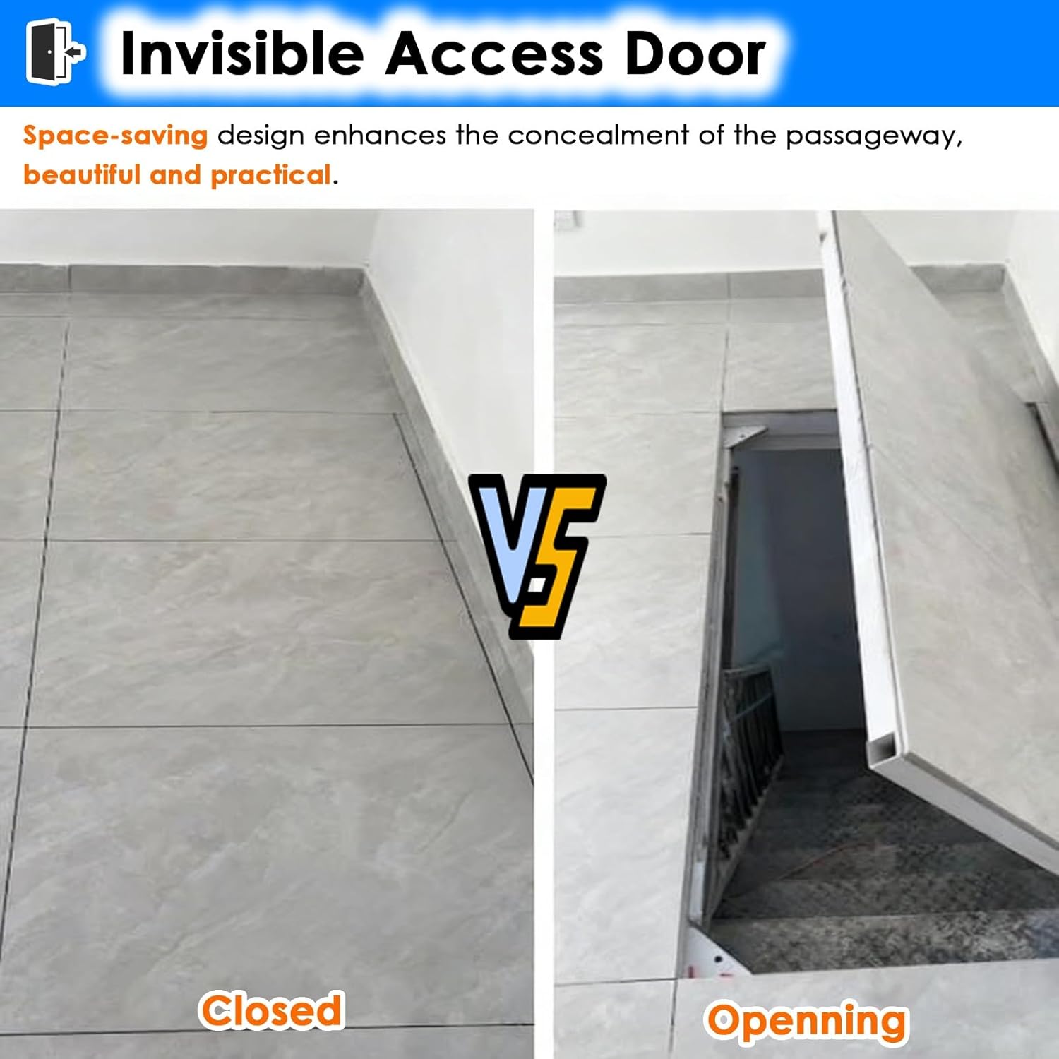 Manual Hidden Door—Is It Difficult To Open and Close?---No. The pneumatic spring support rod design requires minimal force to push or pull, making it effortless for seniors and children to operate.Will It Match My Home Decor? ---Compatible with various flooring materials, it becomes virtually invisible after installation without disrupting your interior aesthetics.Is This Access Door Durable?---Made of heavy-duty steel with a load capacity of up to 500 kg/1100 lbs, it handles high foot traffic, storage, and diverse applications.Is There Small Space Under My Stairs for This Door?---Custom sizes are available, precisely fitting narrow corners and under stairs, making the most of space.Is There a Risk of Pinching Fingers with Young Children At Home?---No. The pneumatic spring support rod prevents the door panel from rapidly descending and pinching fingers.What Are the Key Advantages of Manual Hidden Doors over Electric Models---They offer a more affordable price point, eliminate motor failure risks, and function reliably during power outages, delivering superior value for money.Is Installation Difficult?---All necessary hardware is included for quick and easy self-installation.How to Maintenance?---Minimal upkeep—just wipe clean. Withstands daily use with virtually no maintenance costs.SpecificationMaterial: SteelSize: Length × Width (Customizable)Thicknesses: 1.5mmFrame Tube: 4x8cm (1 1/2 x 3 in)Max Load: 500kg/1100lbsPackage Include1 x Invisible Cellar Door ( with Screws and Suction Cup )