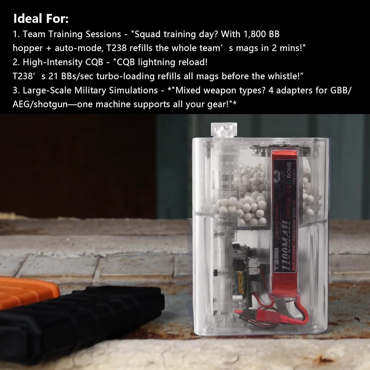 | Included Components | 11.1V 1100mAh Lipo Battery*1, Adapter Set (Type A/B/C/D)*1, Product Manual*1, T238 Electric Speed Loader PRO Edition*1 |